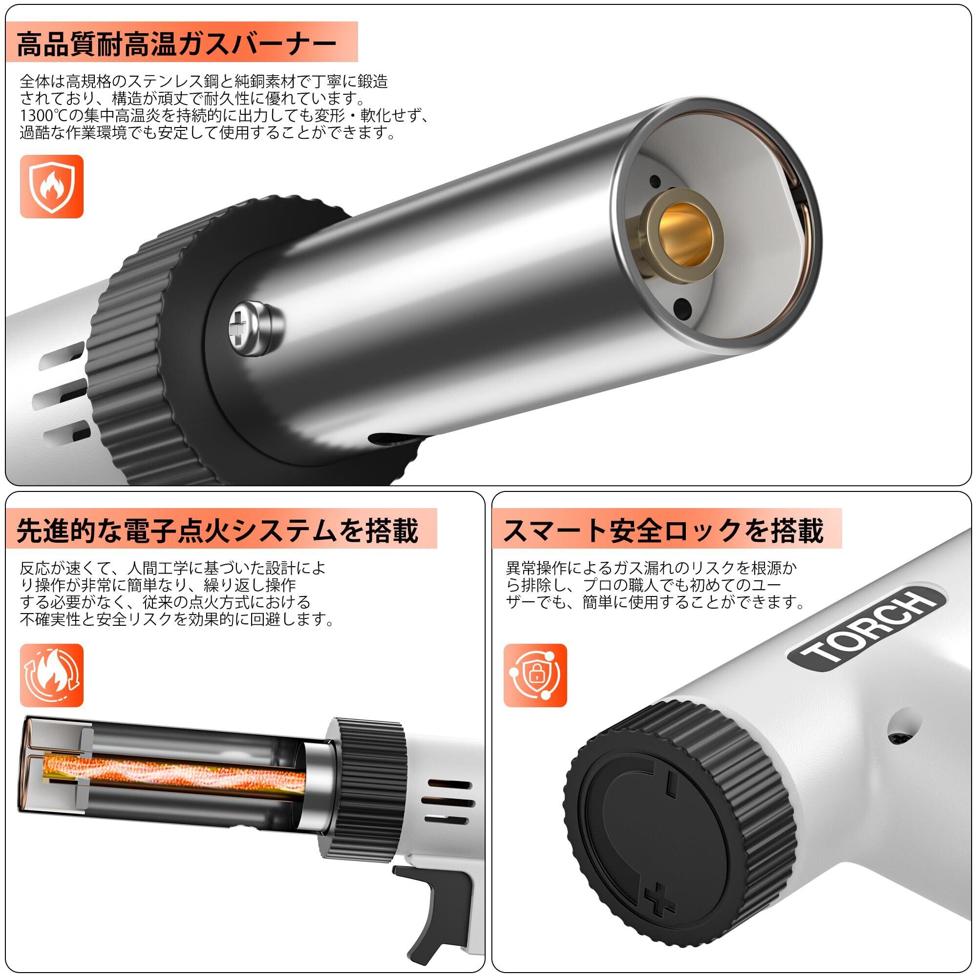 【多角度で安定点火】 アップグレード版ガスバーナーは、逆さまや斜めの状態でも点火可能です。最適化されたシステムにより、どの角度でも安定した炎を維持することができます。全方位対応の設計で使いやすさと安全性を高め、炎が途中で消える心配がなく、さまざまな作業姿勢でも安心して使用できます。