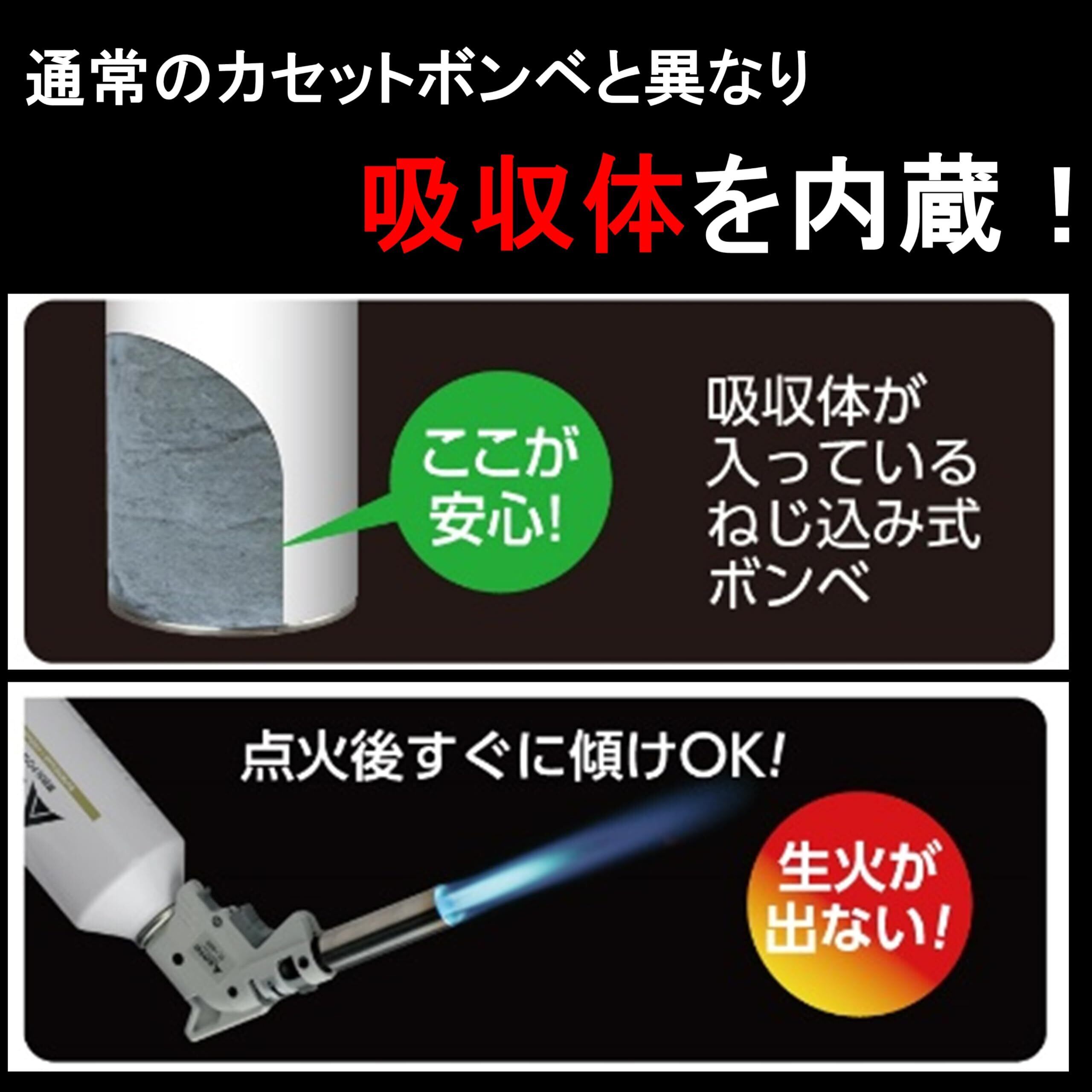 新吸収体の採用とロング缶による容量アップの相乗効果で、「低温時でも強力パワーを持続する」業界ナンバーワンスペックのプロ仕様ボンベ。 ねじ込み式。 継ぎ目の無いシームレス缶の採用で通常のカセットガスに比べ、耐圧強度が1.5倍アップ(メーカー実験データ) 残ガス量が少なく経済的(業界最小レベル)(メーカー実験データ) 吸収体に古紙を使用。環境にやさしい。 RZ-860の3本パック。 新富士バーナー RZ-ねじ込み式バーナー製品専用ボンベです。