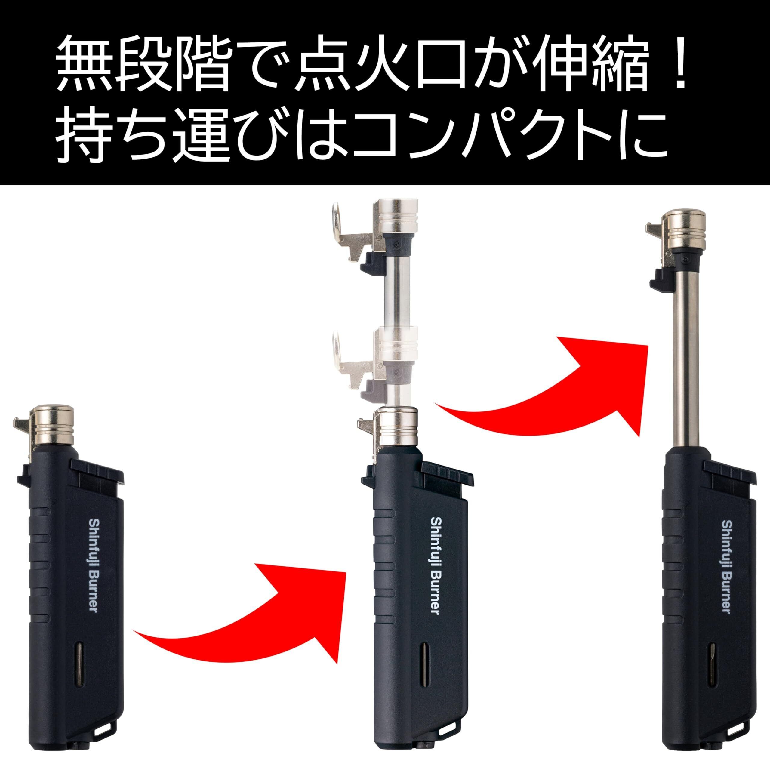 火口が伸縮するので使用時は伸ばして安全に着火を、収納は縮めてコンパクトに持ち運びできます。