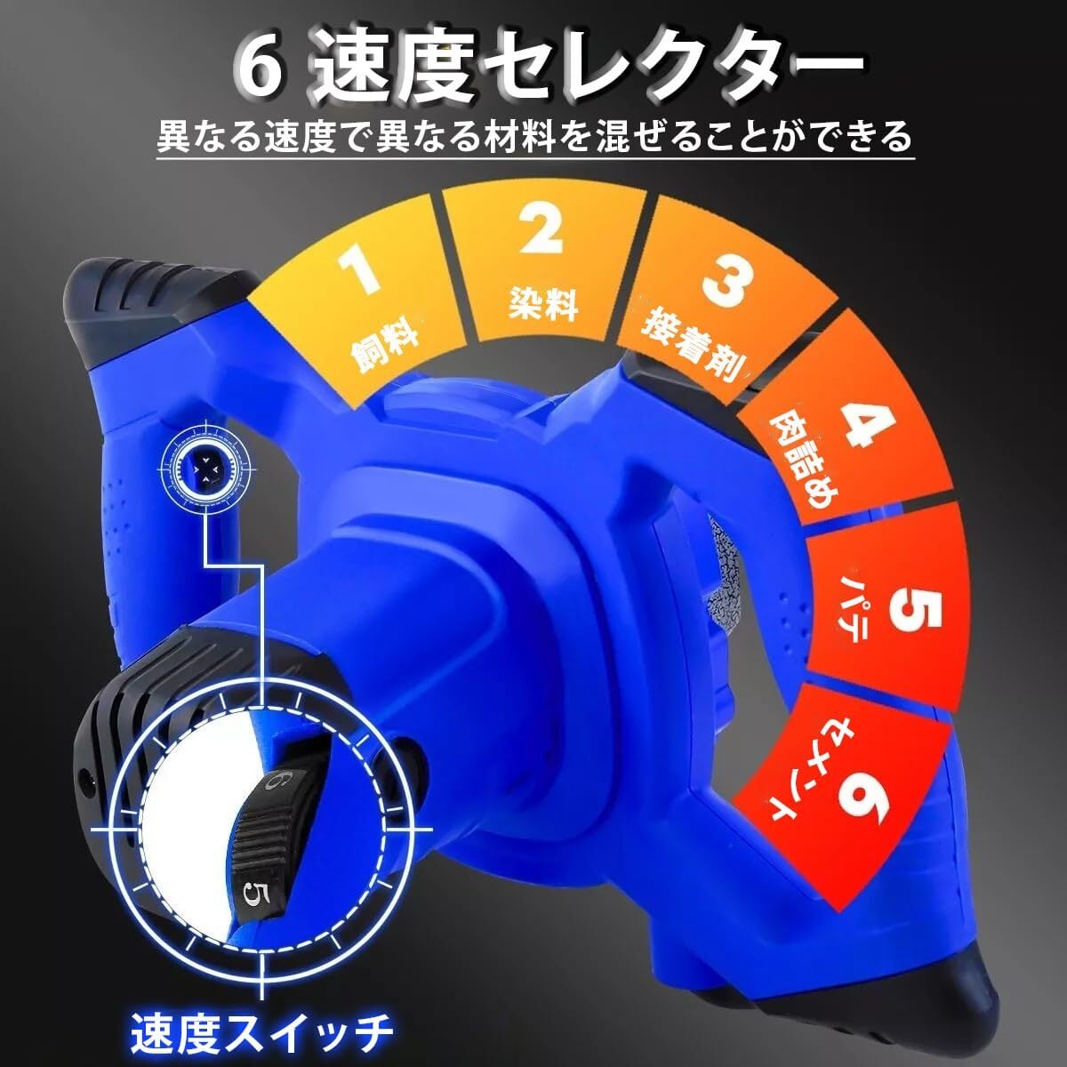 【6速調整可能】6速調節機能を搭載し、作業内容に合わせてスピードを設定できます。ロックボタンと6速ギア切替スイッチを装備し、幅広い材料に対応し、スピードの出し過ぎによる材料の飛散や混合を防ぎます。低速では低騒音、高速では高効率。家庭でも現場でも使用可能。