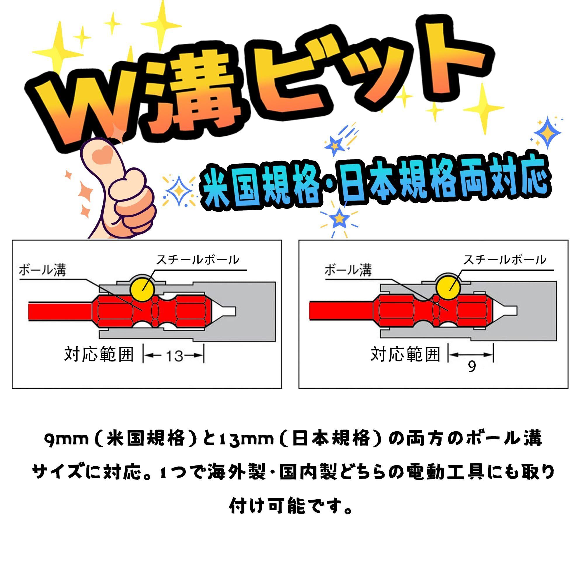 日米インパクトドライバー対応:ドライバービットは9mmと13mmの2種類のボール溝設計を採用しており、日本規格および米国規格のインパクトドライバーや電動ドライバーに対応。異なる規格のビットを複数購入する手間を省きます