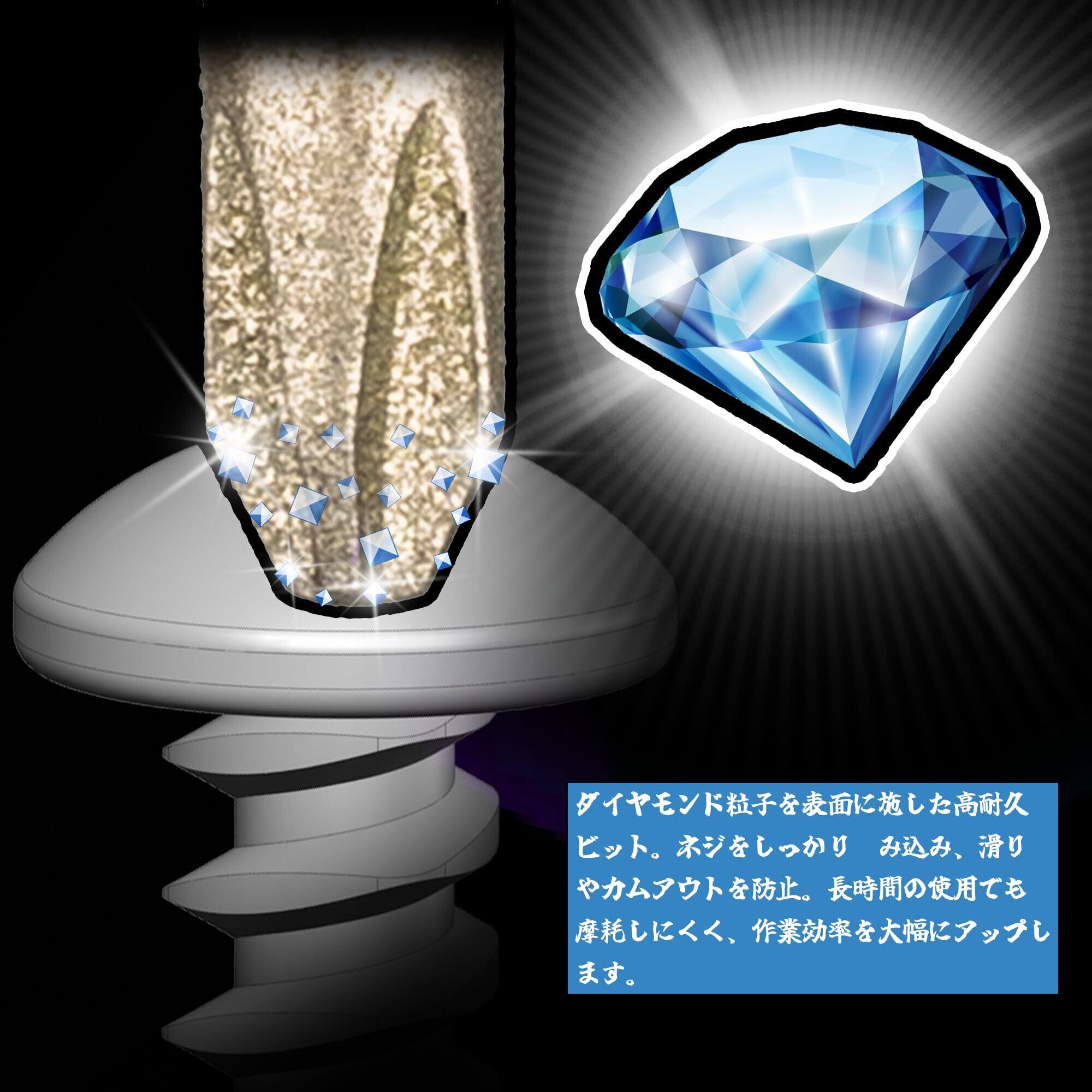 強力な食いつき力:ダイヤモンドビット先端にダイヤモンド粒子を埋め込み、食いつき力を大幅に強化しました。優れた防滑性能を備え、磁石が付かないステンレスネジでも落ちにくく、作業効率を大きく向上させます