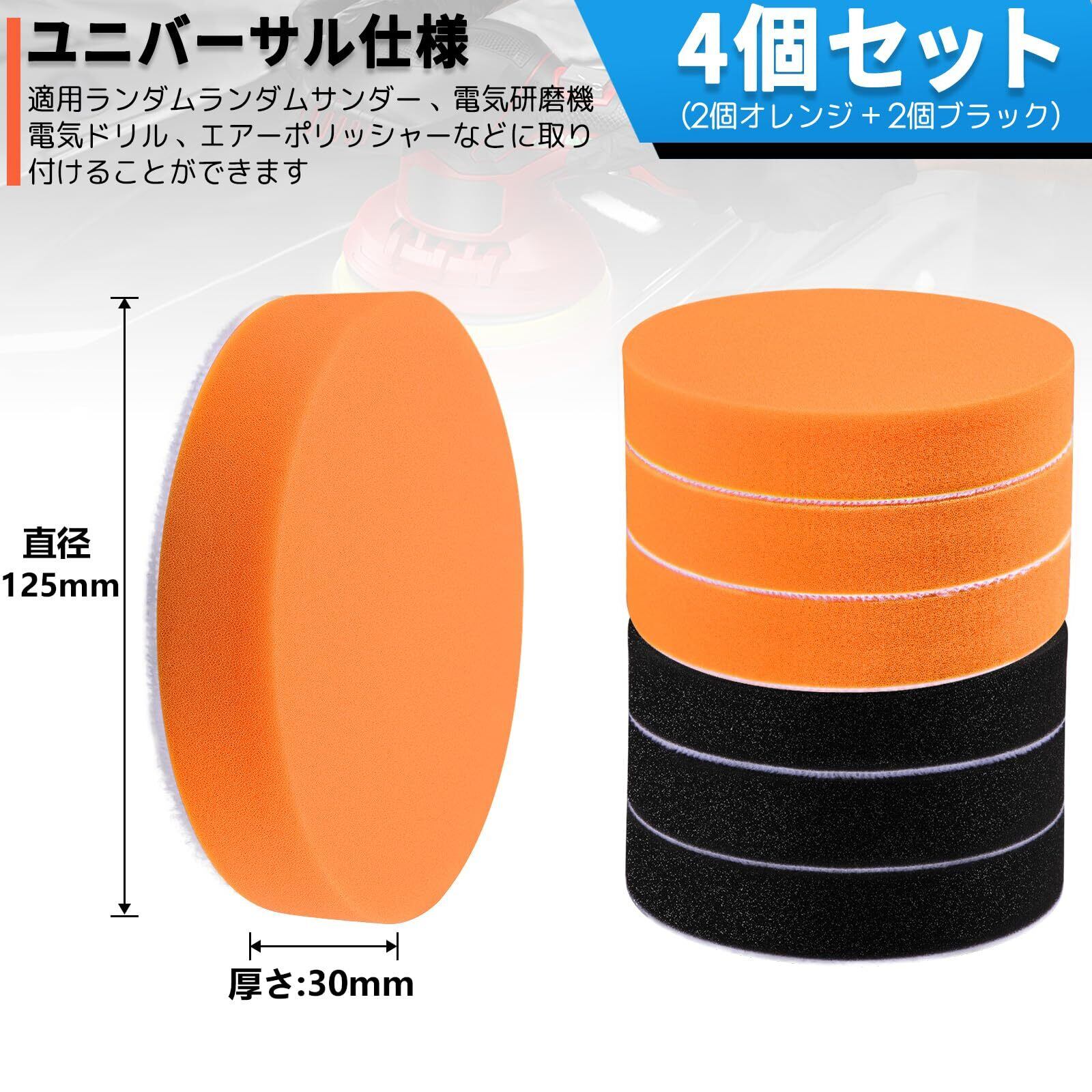 【在庫限り】スポンジバフ 125mm ポリッシャー バフ 4個セット 車磨き用 仕上げ 研磨スポンジ マジックテープ 超細粒子の柔らかウレタン 曲面研磨アダプター(2個オレンジ + 2個ブラック)