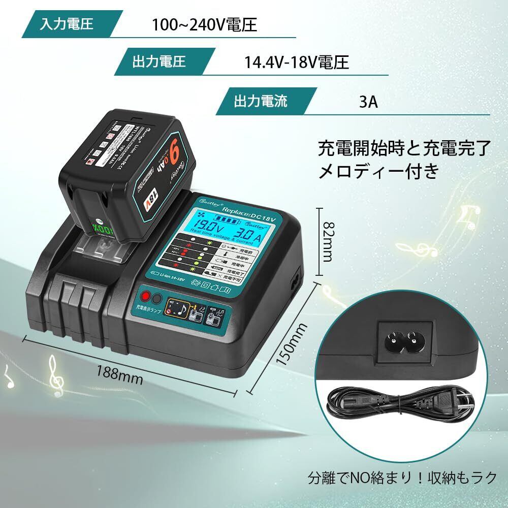 【商品仕様】マキタスライド式バッテリーは14.4V、18Vの電圧に充電可能!最新・最適充電制御により充電時間短縮!ブルーライト搭載の液晶画面で見やすく、リアルタイムに電流・電圧を表示し、充電状況が明確に分かります。充電開始と充電完了メロディ付き!