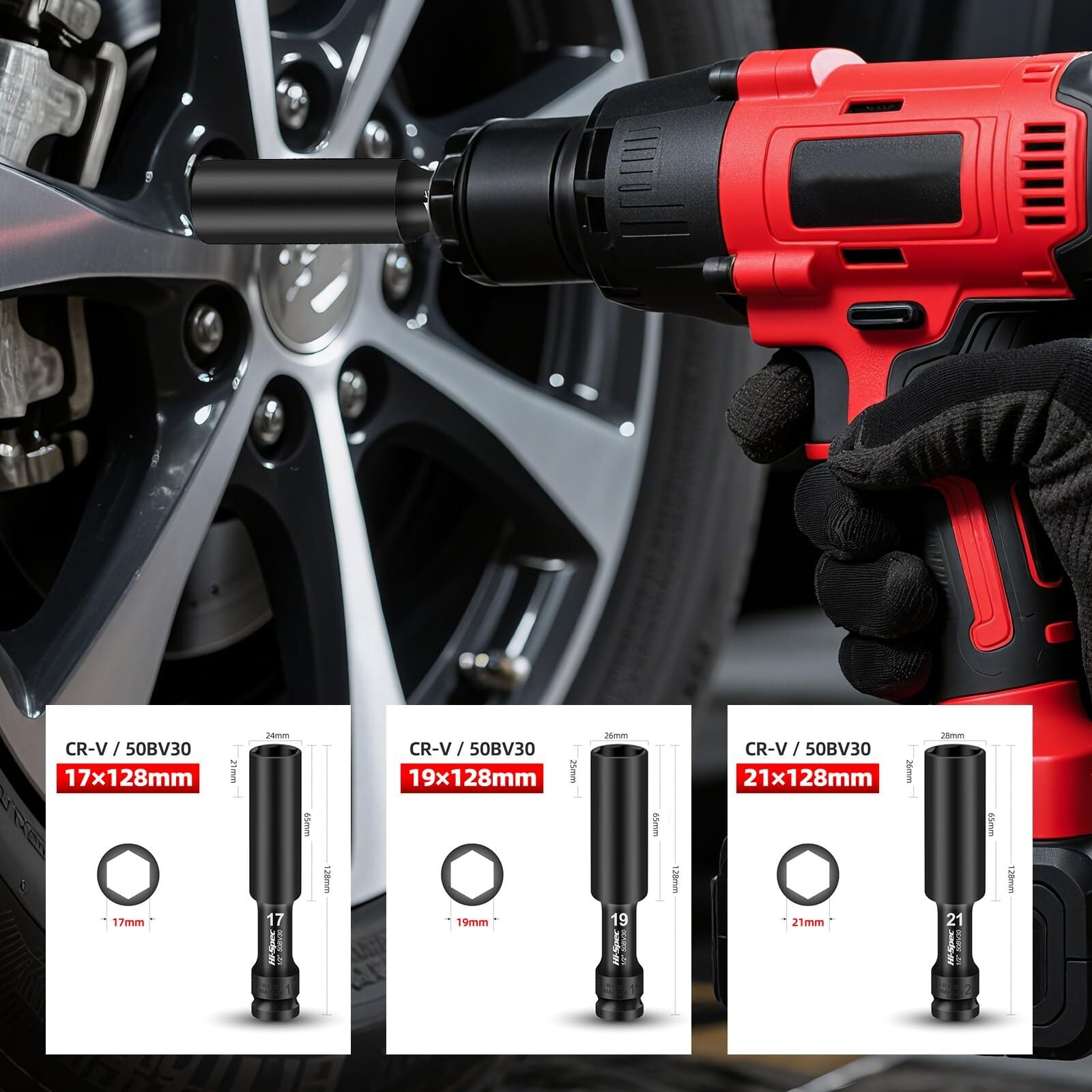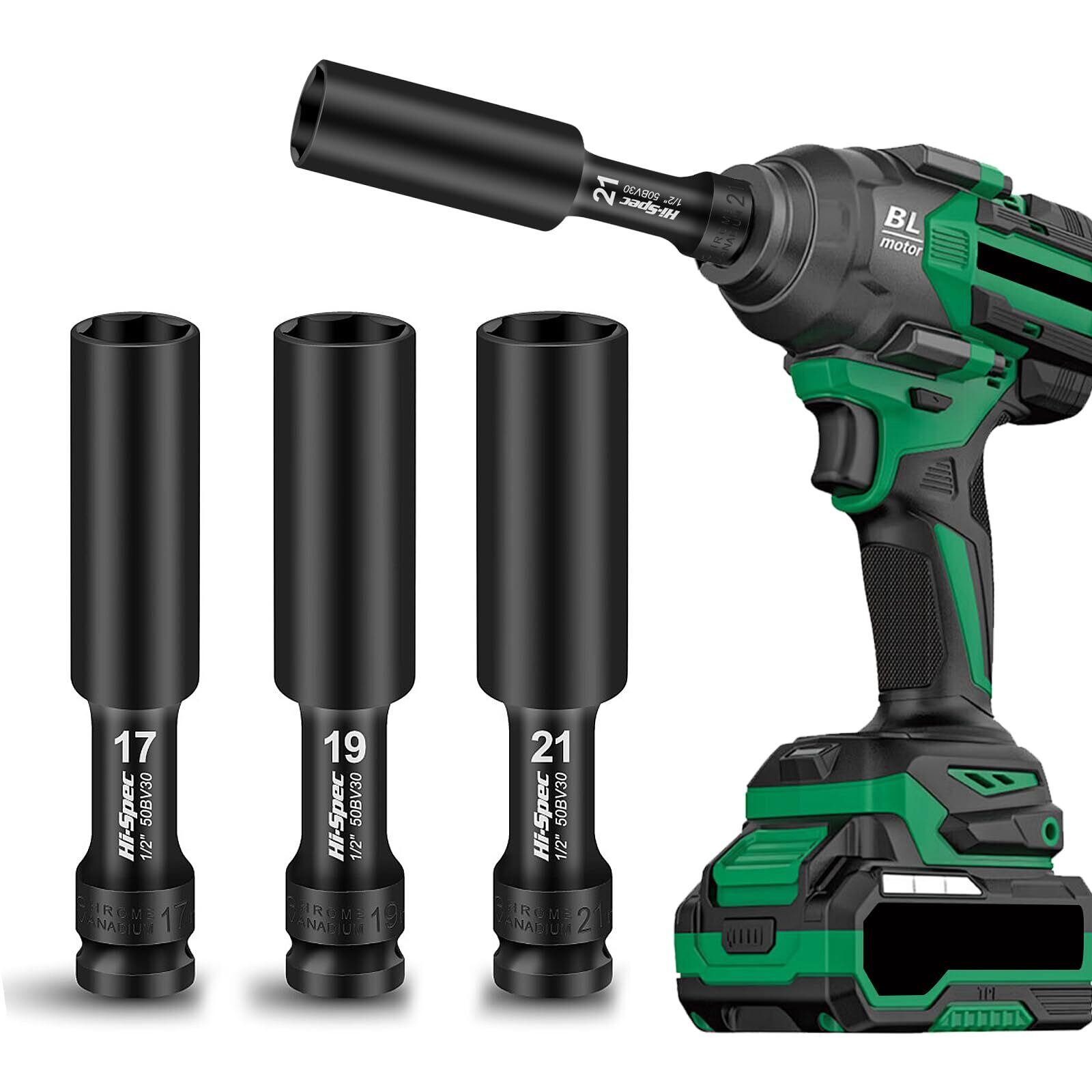 3点セット インパクトレンチ用 ホイールナットソケット 延長型 六角 薄型 ディープソケット 17mm 19mm 21mm 全長128mm 脱落防止 バイク 車修理 差込角 12.5mm
