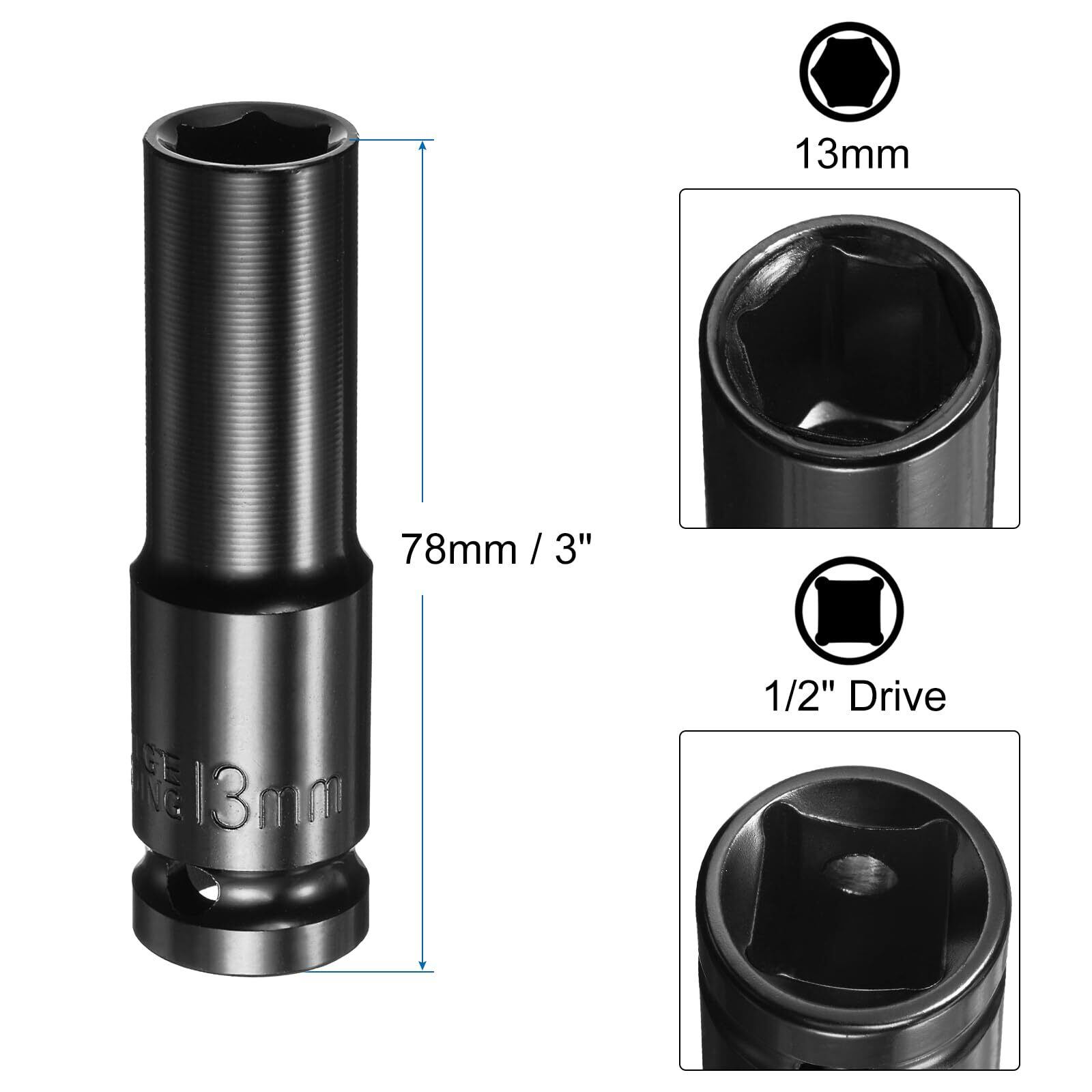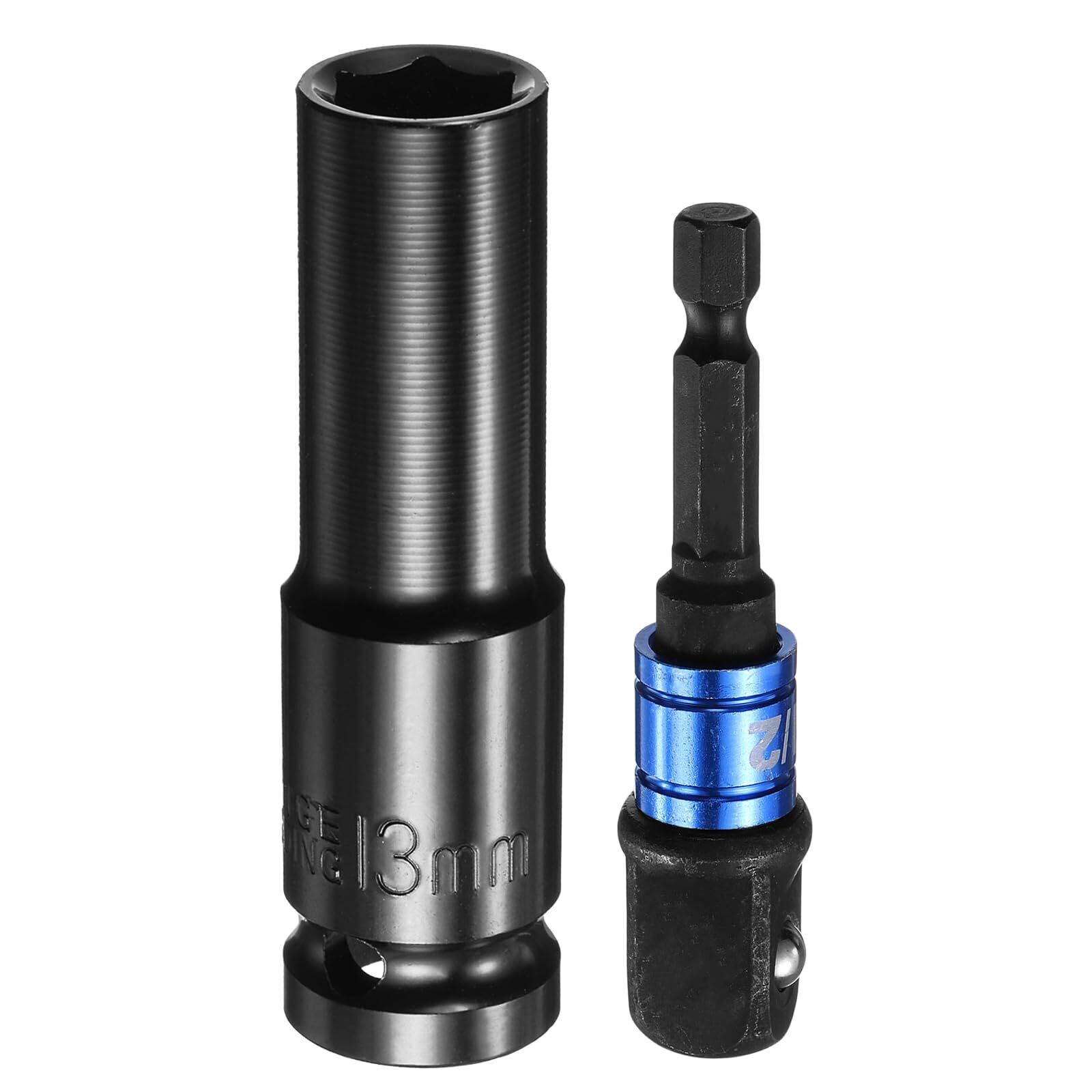 【特価セール】uxcell インパクトソケット 13 mmメトリックソケット 差込角1/2"ドライブ 78mm長さ 1/4"六角軸アダプター付き 電動手動兼用 ディープ6角 CR-Vスチール アダプターアクセサリーツールセットキット ヘックスボルトナット用