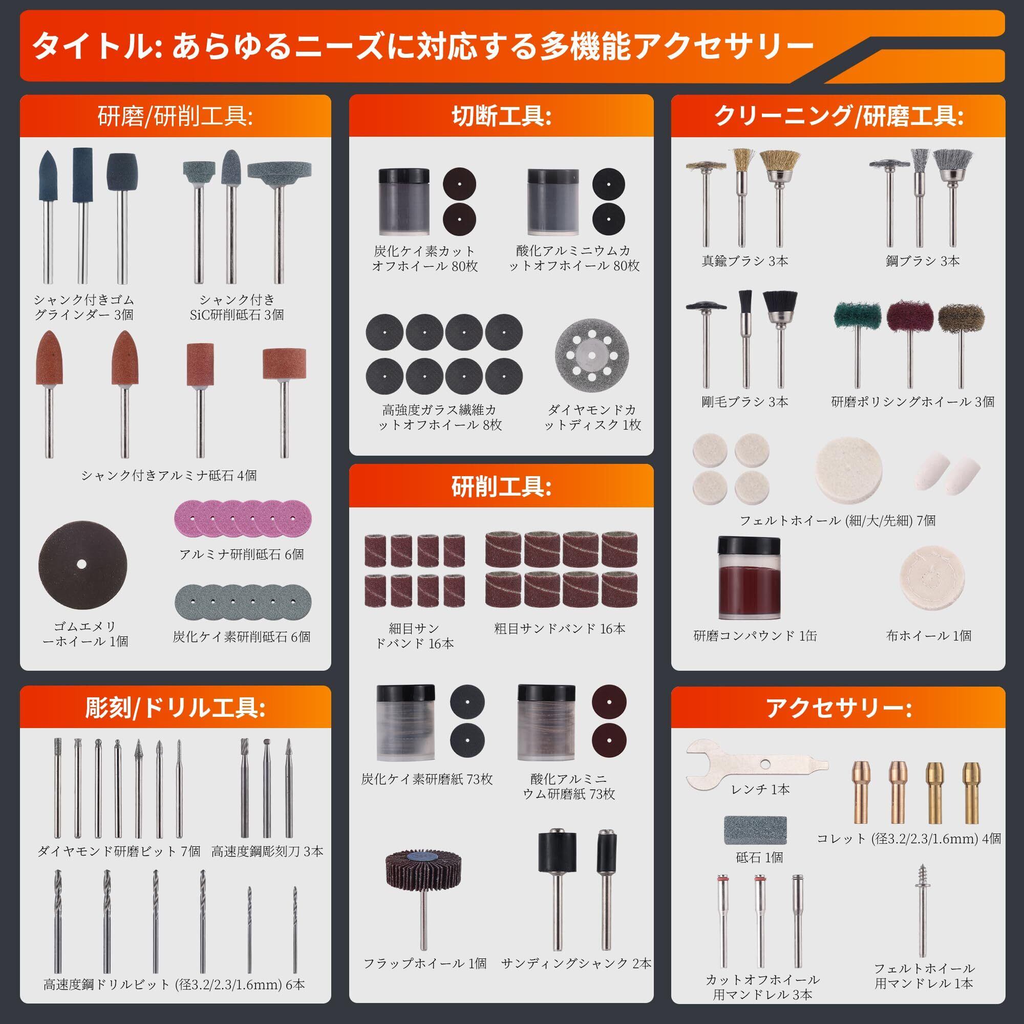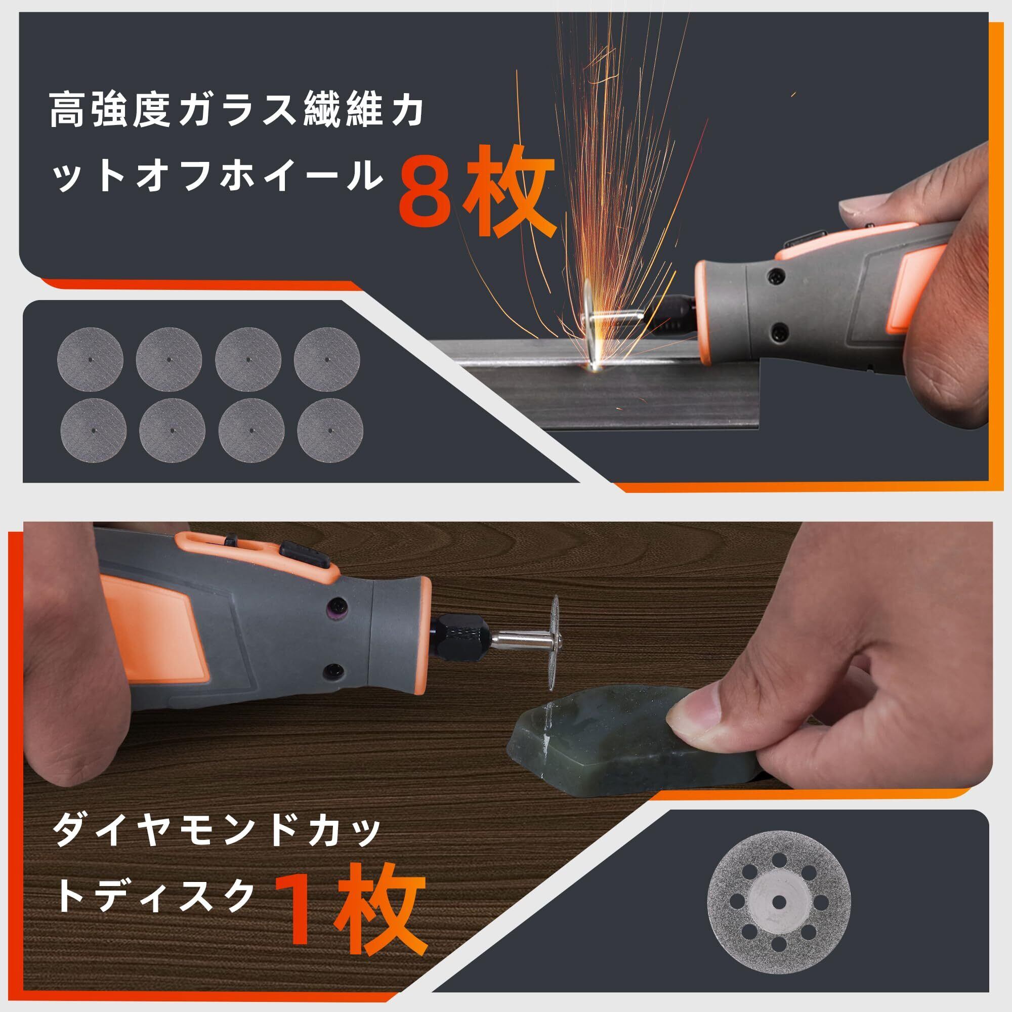 商品の推奨用途 DIY作業全般、木材・金属・プラスチックの切断・研磨・穴あけ、ガラス・タイルの彫刻・クリーニング、手作りクラフト、家庭の簡単修理、車・自転車のメンテナンス、初心者からプロまで対応