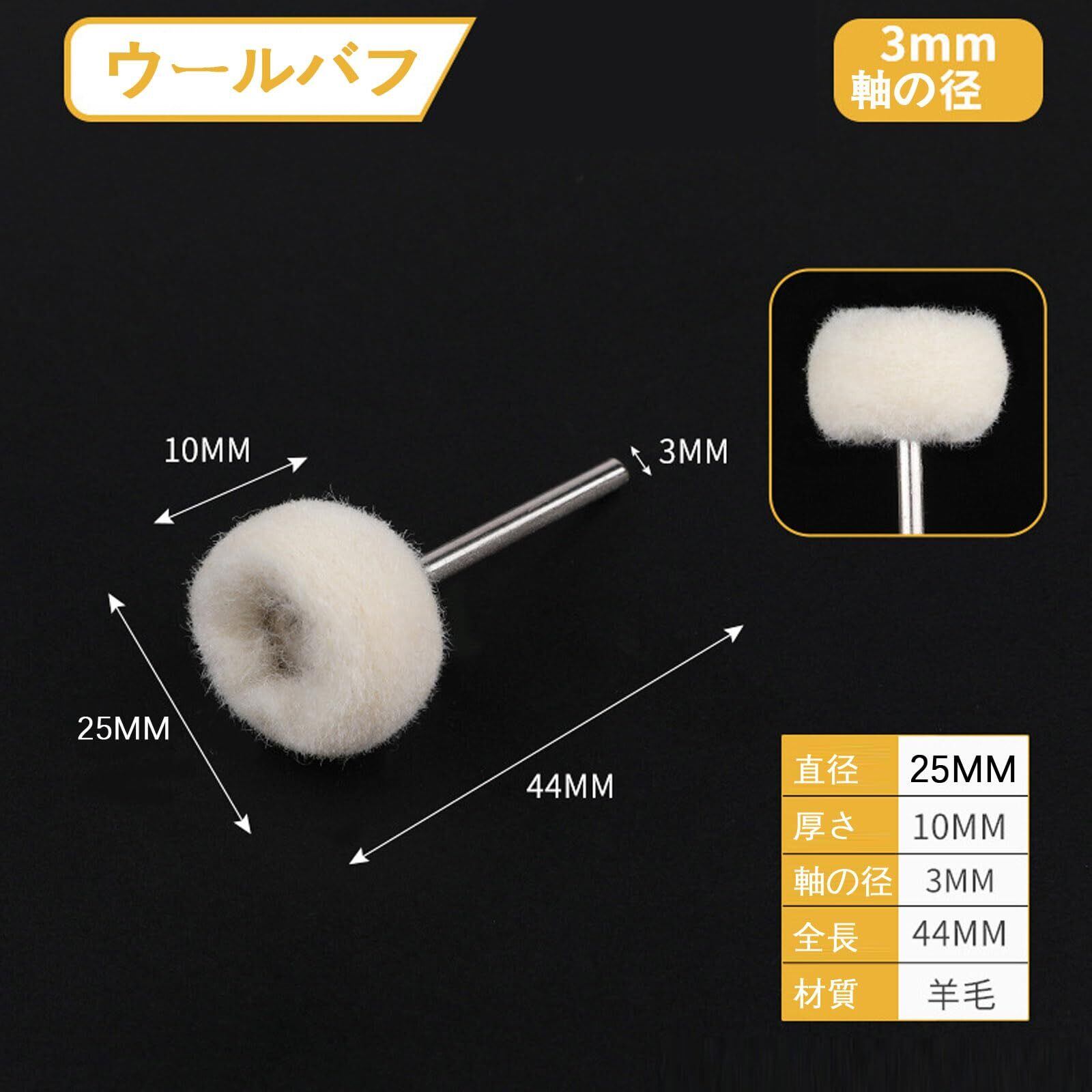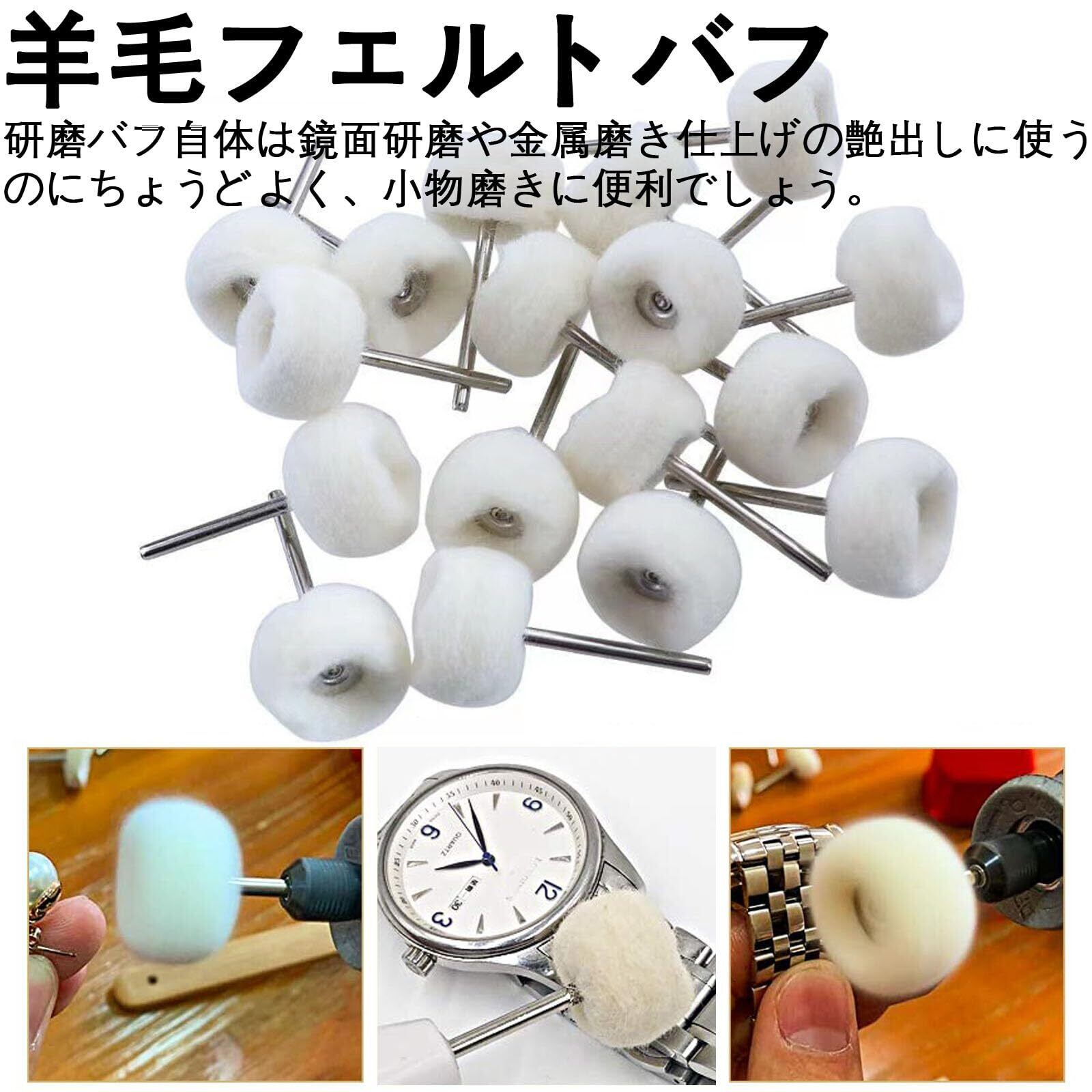 【商品仕様】2.35ミリまたは3ミリ軸のフェルトバフ30個セット。研磨ヘッドは柔らかい羊毛と金属で作られています。二種類があるので磨くパーツの直径、場所によって使い分けできます。軸の径は2.35mm/軸系が3mmなので、小型のリューターでも掴めるサイズ。粒度が何種類か有りたくさん入ってます。