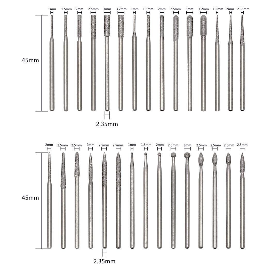 【超硬バー】ダイヤモンド製で30種類ヘッド、シャンク径:2.35mm、全長は約45mmです。セットの本体重量は約0.1kgです。