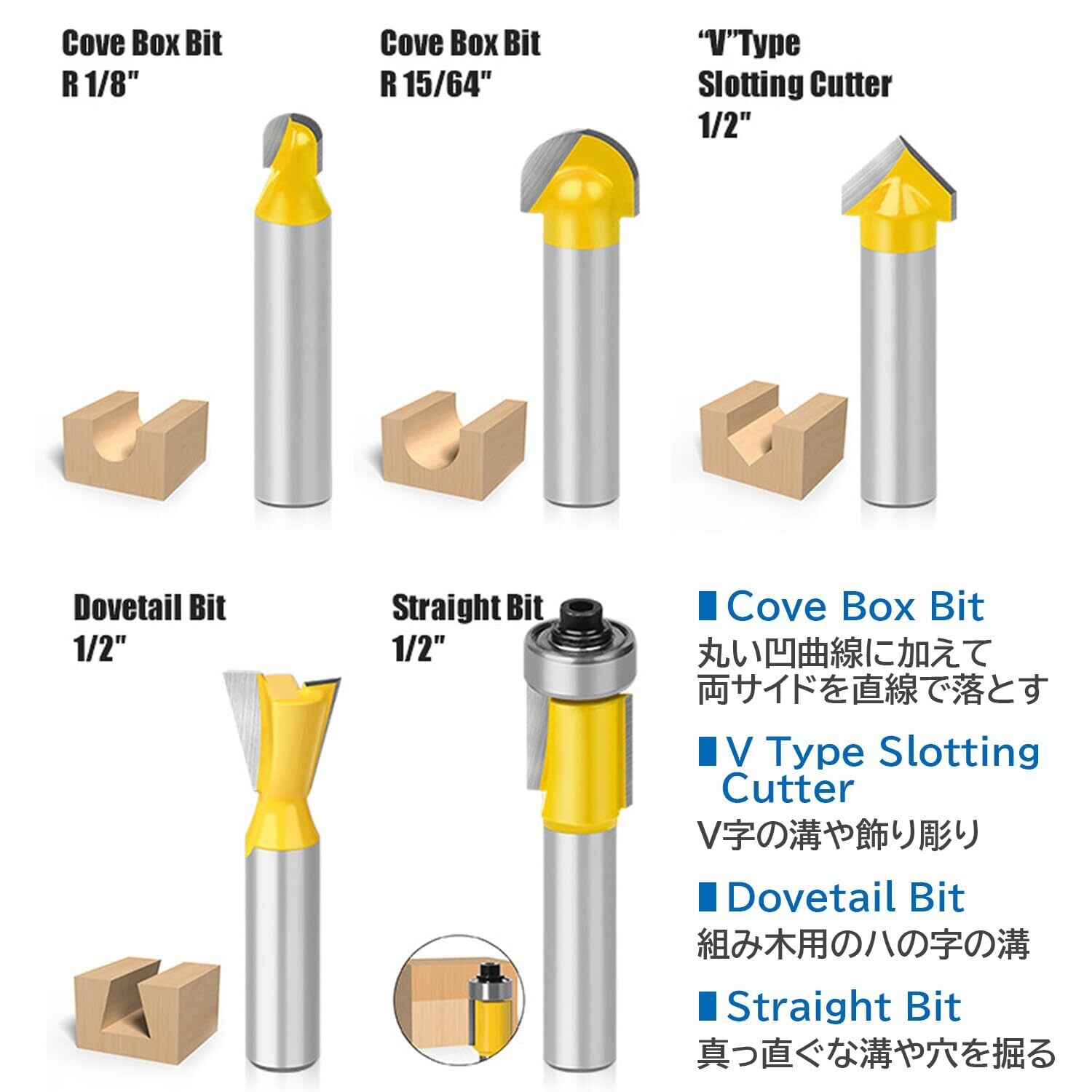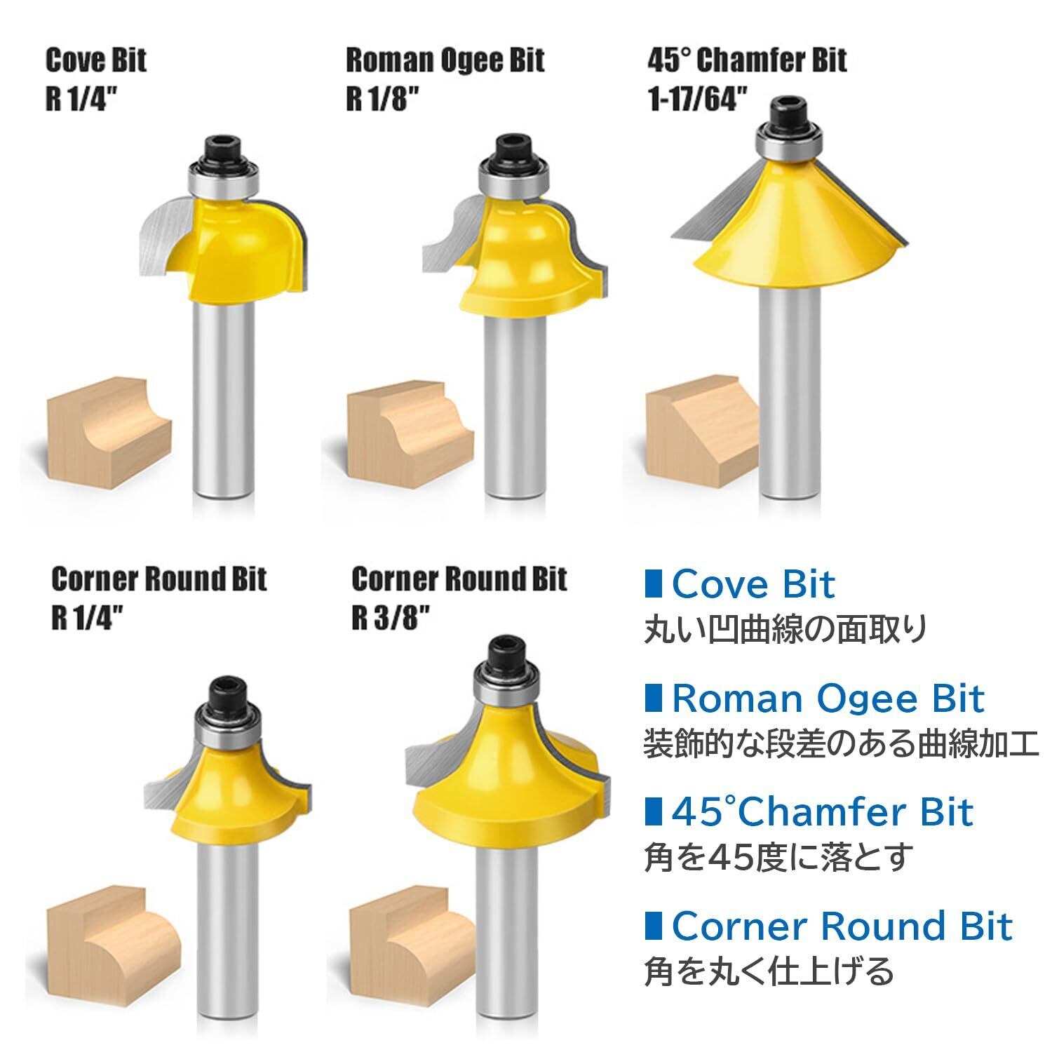 【商品説明】 ・タングステン鋼合金製の刃部を採用。表面塗装により美しい仕上がりを実現し、最大の強度と耐久性を備えています。溝ほり・面取り・飾り面加工など幅広い加工に対応。 ・経験豊富な大工も選ぶ、使用頻度の高いビット15本をセット。木製収納ボックス付きで整理・持ち運びも簡単です。 ・ソリッドウッド、MDF、ラミネート、パーティクルボード、合板コンパクトパネル、アクリルなどの木材に最適。※鋼・鉄・砂などの非木材素材には不適。 ・シャンク径6.35mm、彫刻機、フライス盤、トリミングマシン、コンピュータ彫刻機、垂直トリマーなどに対応。幅広い木工作業に活躍します。 (使用上の注意)この商品は彫刻・装飾加工用で、穴あけには適していません。使用中の表面色落ちは通常の仕様で、性能には影響ありません。