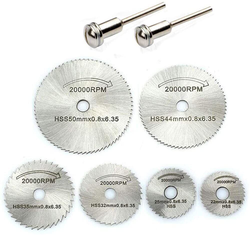 スリッターブレード 丸鋸刃セット 切削ディスク チップソー 丸鋸刃 切削ディスク ミニルーター ビットセット カッター 切断砥石 アルミ切断 切削ディスク直径 (22mm 25mm 32mm 35mm 44mm 50mm)切断鋸 彫刻工具 小径 HSS鋼 金属 木工用 電動研削盤 丸鋸刃セット 電気ドリルに適用可能 高速度鋼切削ディスク 砥石 切断鋸 超硬丸鋸刃 木工用ブレード ミニルーターアクセサリミニルーター/ルーター/マイクログラインダー用(6枚刃+マンドレル*2本 8点セット)