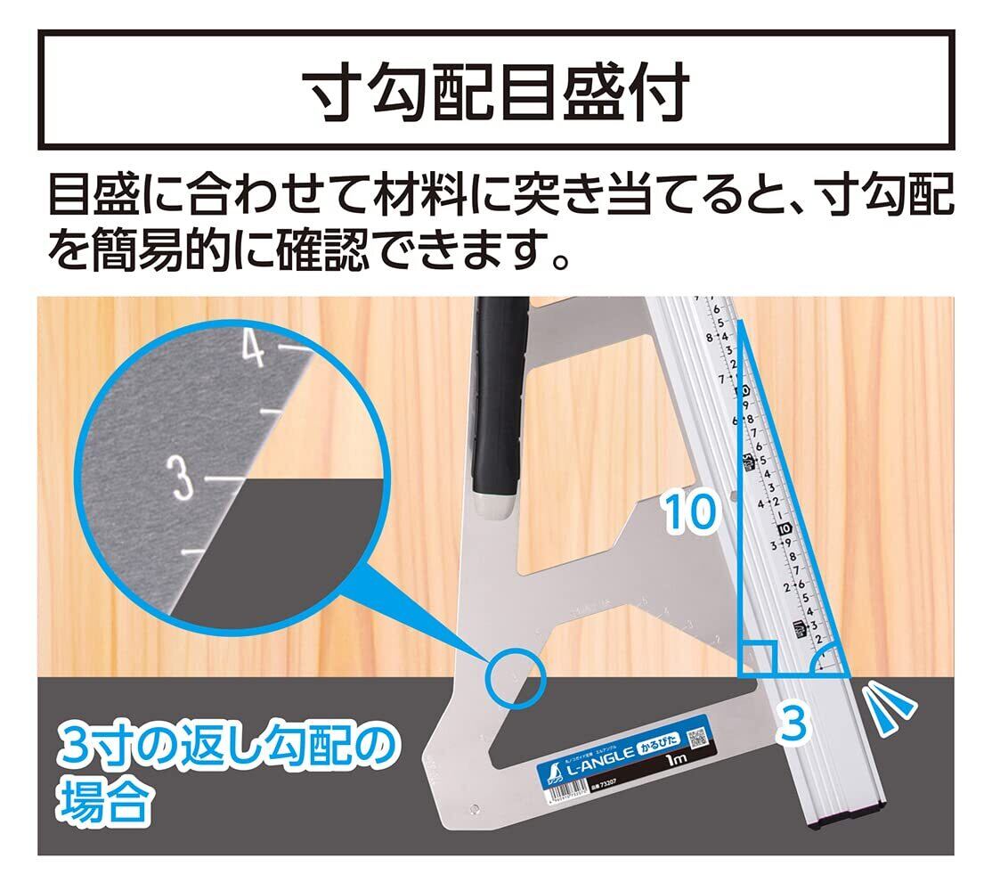 目盛に合わせて材料に付き当てると、寸勾配を簡易的に確認できます(1寸~5寸勾配)。
