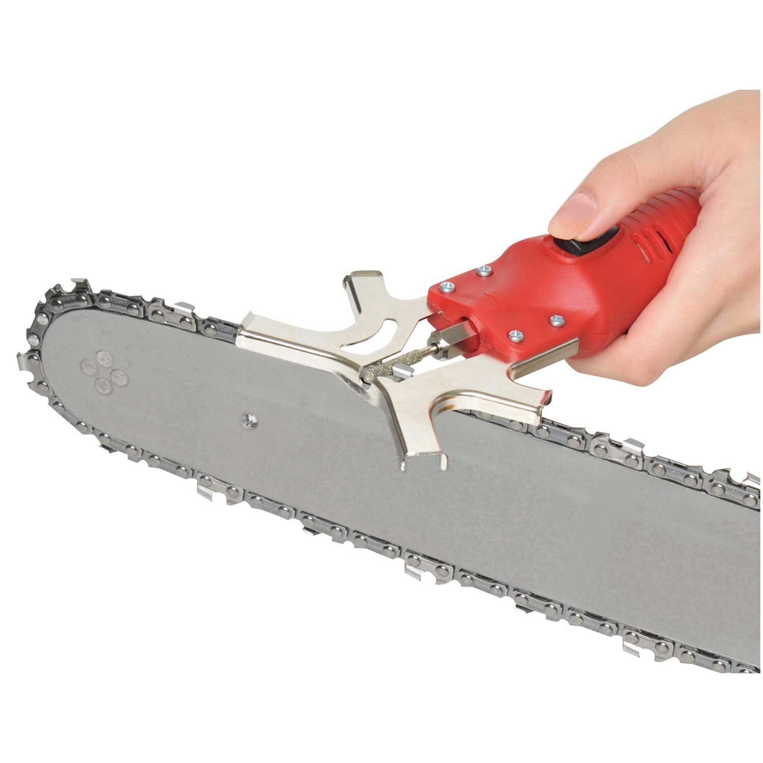 屋外でも使える! 単三電池式チェーンソー研磨機! 毎分20000回転超、高速モーター採用なので素早く研げる! 簡単ガイド装着で、研磨角度が正確! 横にスライドさせるだけのカンタン研磨! 永く使える超硬ビット、仕上に便利なデプス調整器など、様々なオプション品でチェーンソー研磨のニーズを満たします。 ※こちらは本体のみとなります。