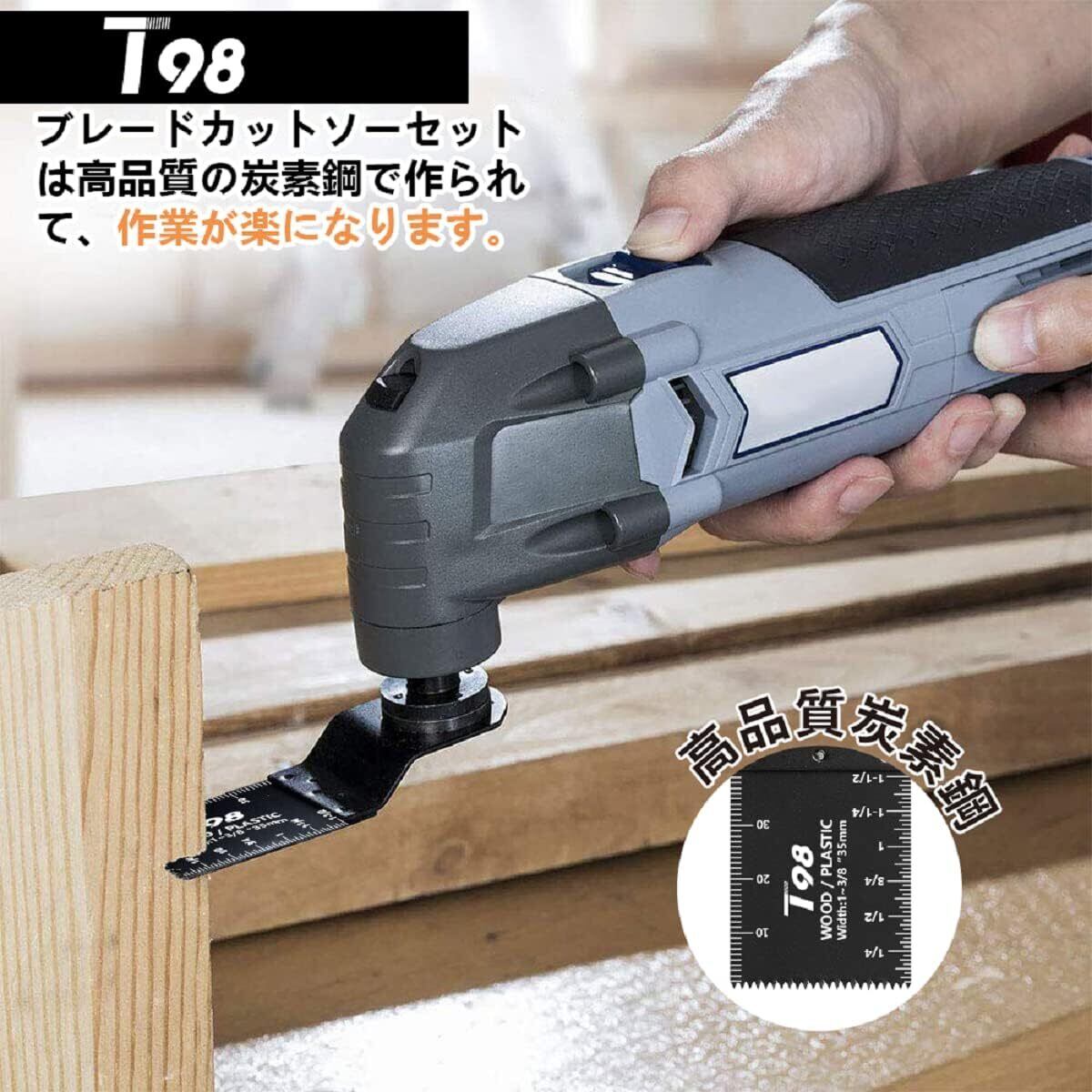 【多用途】T98ブレードカットソーセットは使用頻度高い、多用途のブレードカットソーをセットにして、木材・釘・金属切断、削り取り、際切り、深切り、タイル目地切断、切り込み、面取り、研磨表面仕上げ加工など幅広い作業に対応しています。