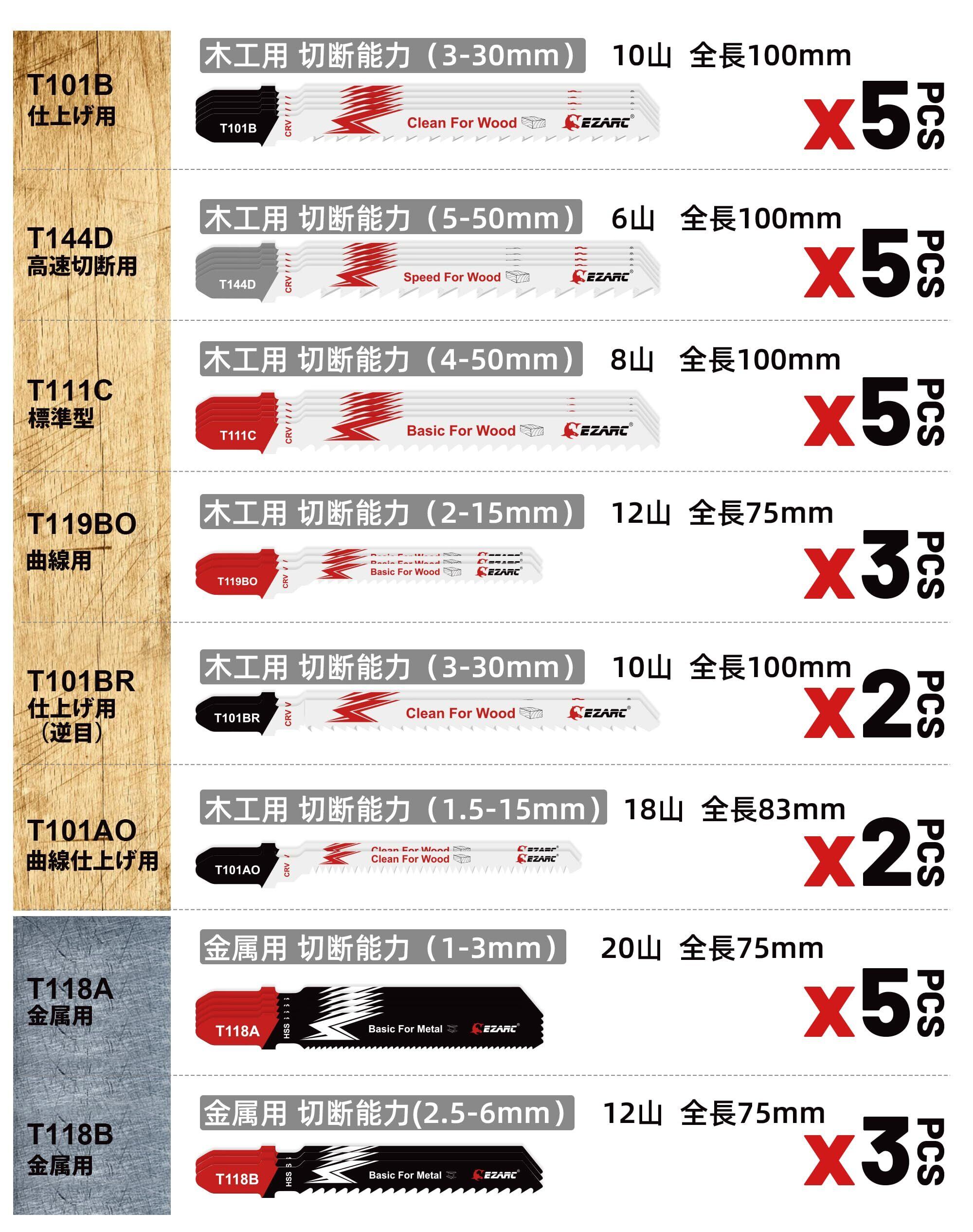 EZARC(イザーク) ジグソー 替刃 30枚入り 多種タイプの刃 直線用と曲線用 高速切断 仕上げ T字型 木工 合板 プラスチック 軟金属用 収納ケース付き