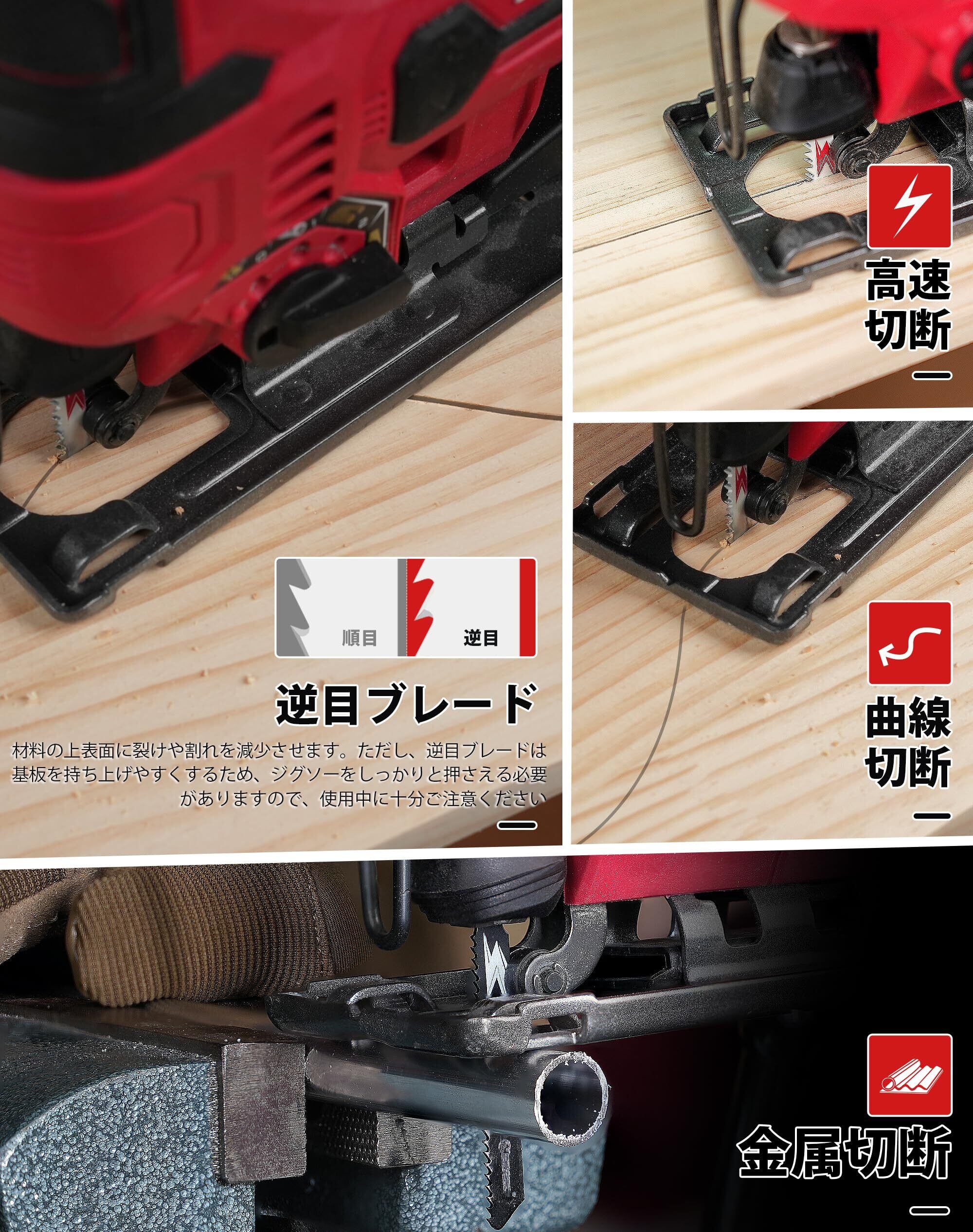 【多種タイプの刃】ジグソーブレード30PCSセットです。直線用と曲線用があり、それぞれに高速切断、仕上げなどの作業に対応できます。
