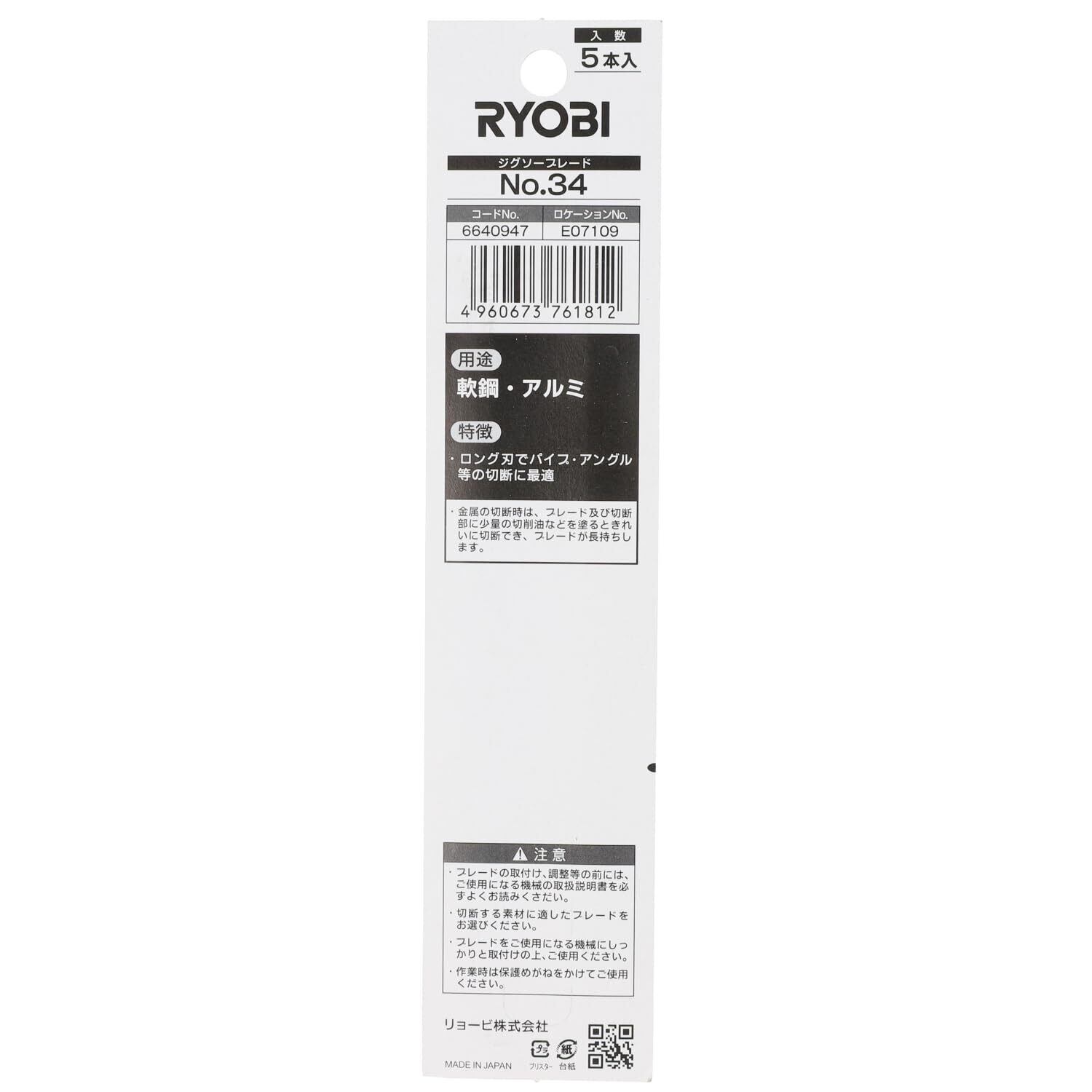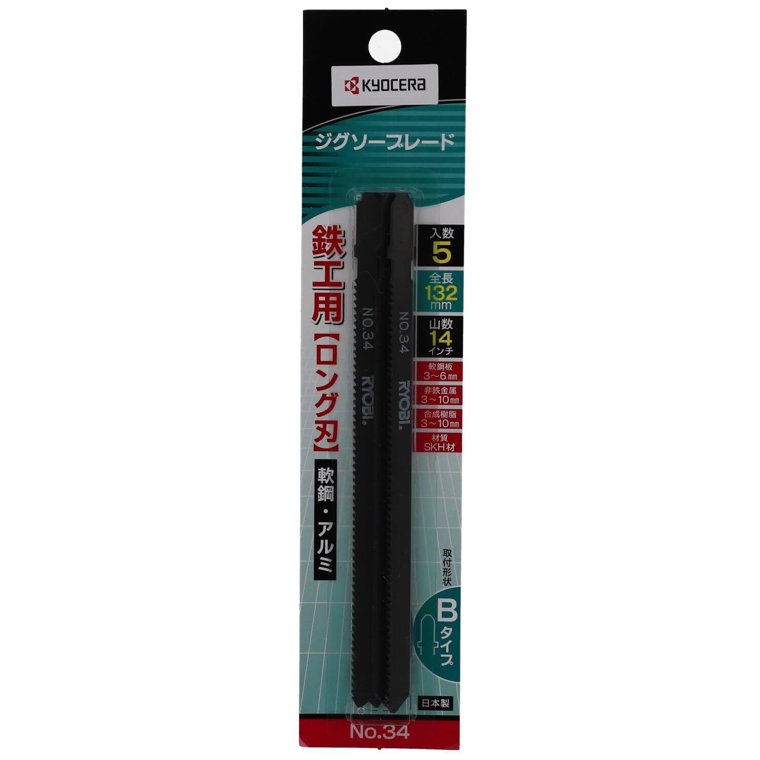 京セラ(Kyocera) 旧リョービ ジグソー用ブレード No.34 66400297 6640947【長刃でパイプ・アングル等の切断に最適】 5本組 取付タイプBタイプ 鉄工用(長刃) 全長132mm 山数14インチ 金属切断時にはブレード及び切断部に少量の切削油などを塗るときれいな切断とブレードが長持ち