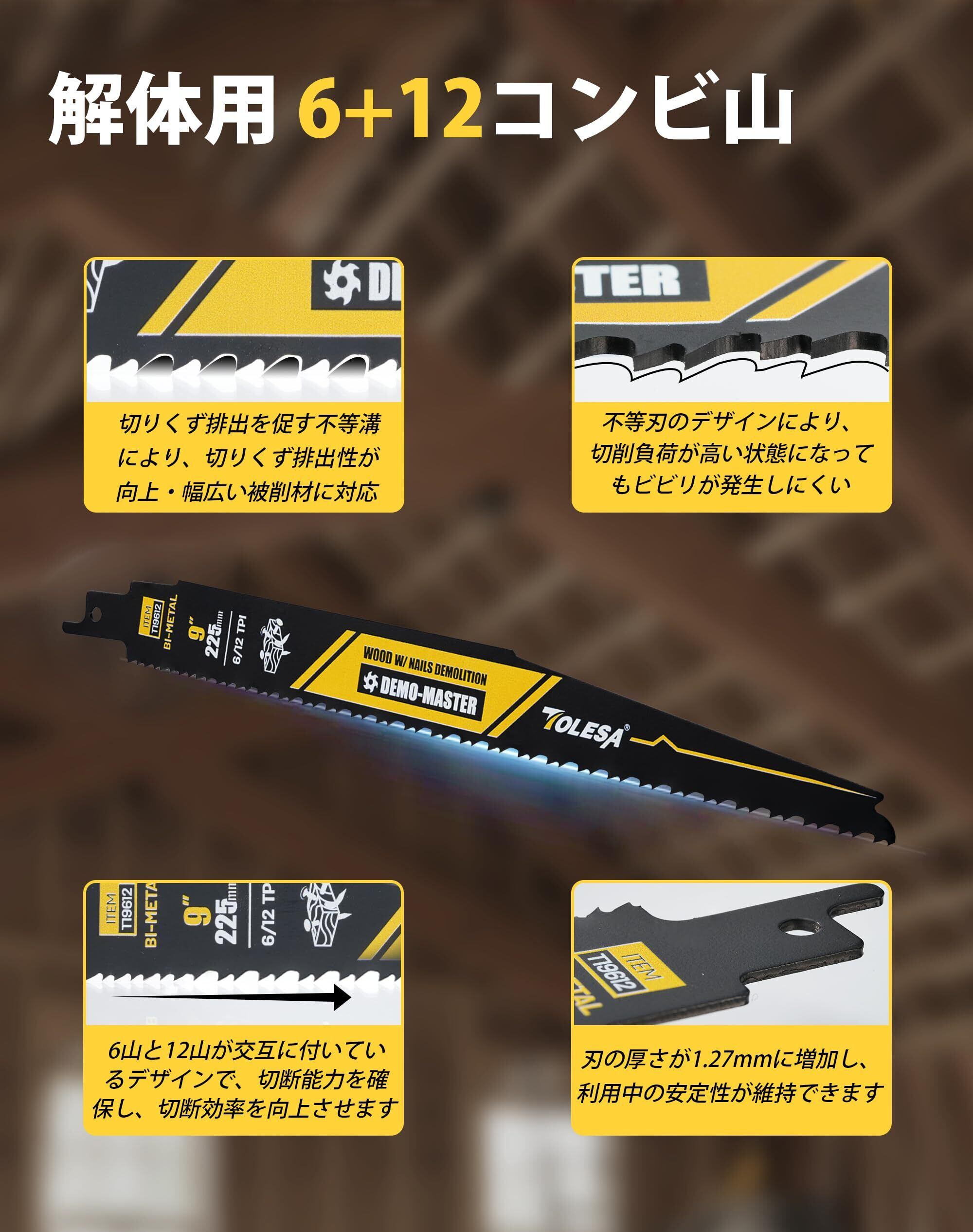 【6+12TPI】ブレードは6山と12山が交互に付いているタイプで、切断能力を確保し、切断効率を向上させます。さまざまな材料を解体する際に適します。