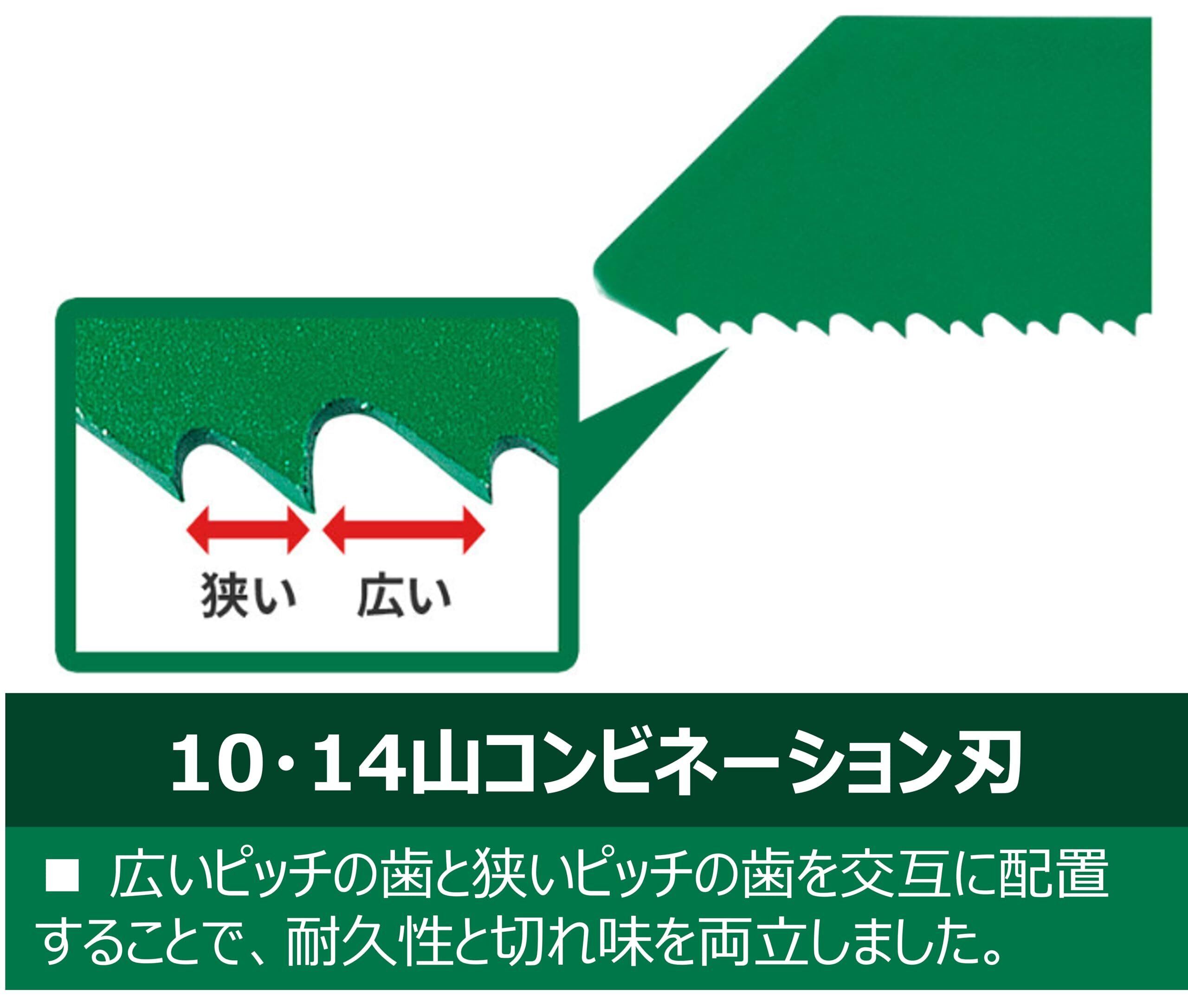 10/14山コンビネーション刃。広いピッチの歯と狭いピッチの歯を交互に配置することで、耐久性と切れ味を両立しました。