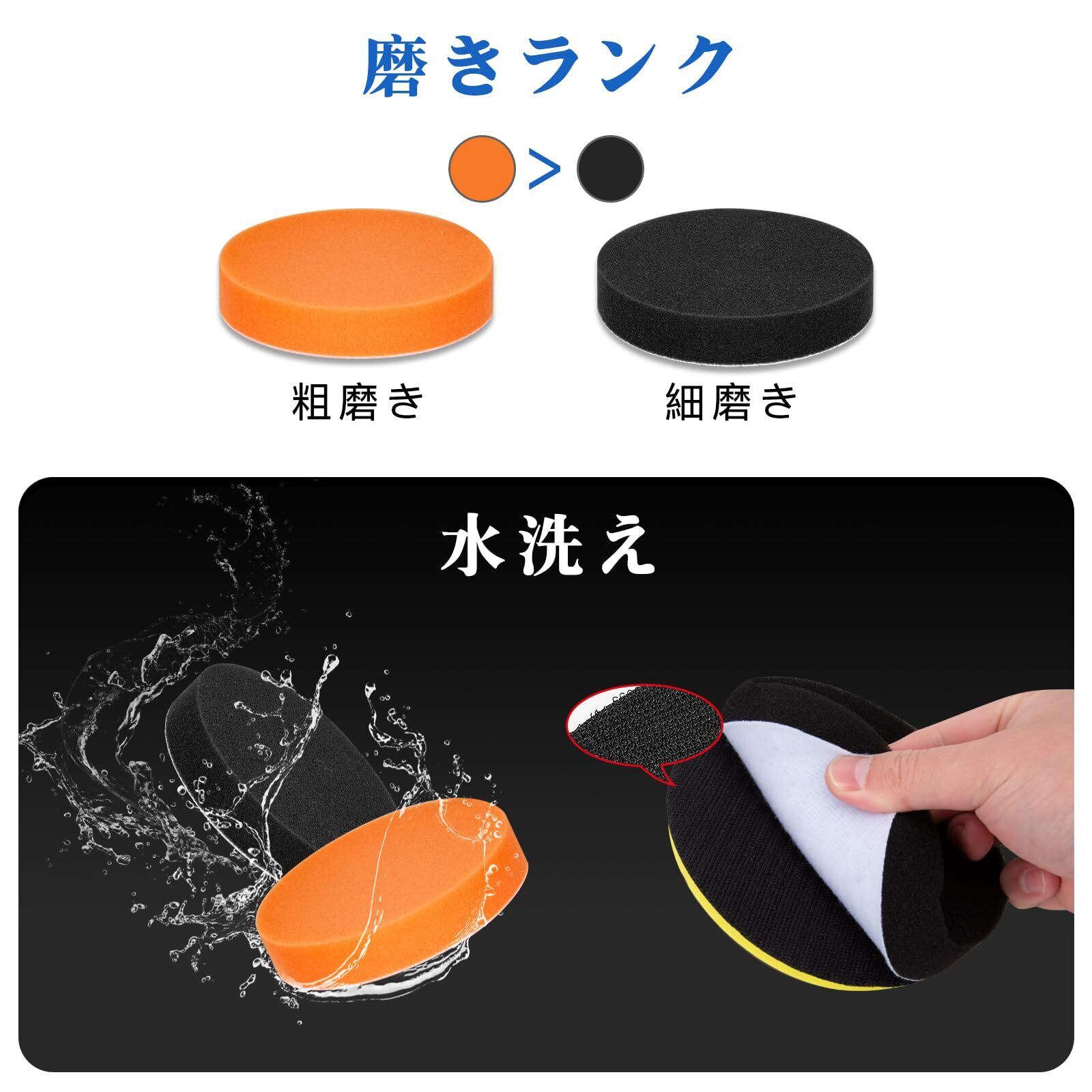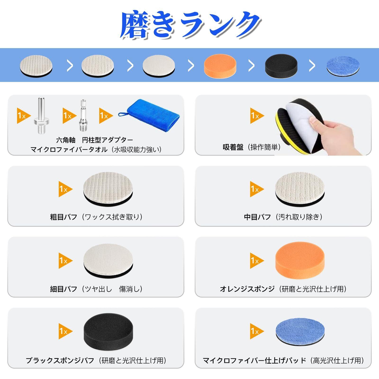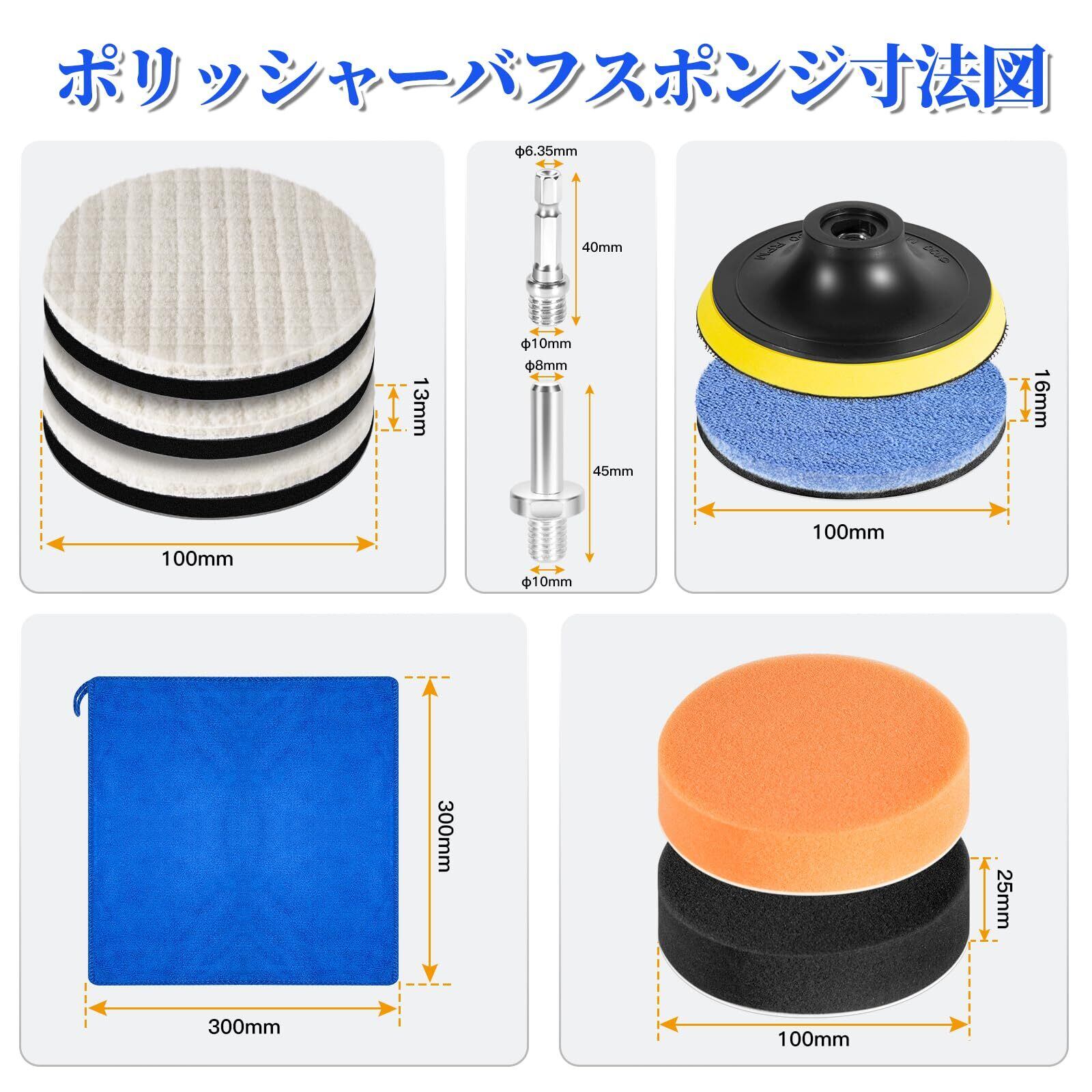 【ポリッシャーセット内容】 ①吸着盤*1個 ②平面スポンジ*2個 直径100 mm、厚み25mm③研磨バフ*3個 直径100mm、厚み13mm④マイクロファイバー仕上げパッド*1個 直径100mm、厚み16mm⑤マイクロファイバータオル*1個 30*30cm ④六角軸アダプター*1個 ⑤円柱型アダプター*1個 合わせて10点セット