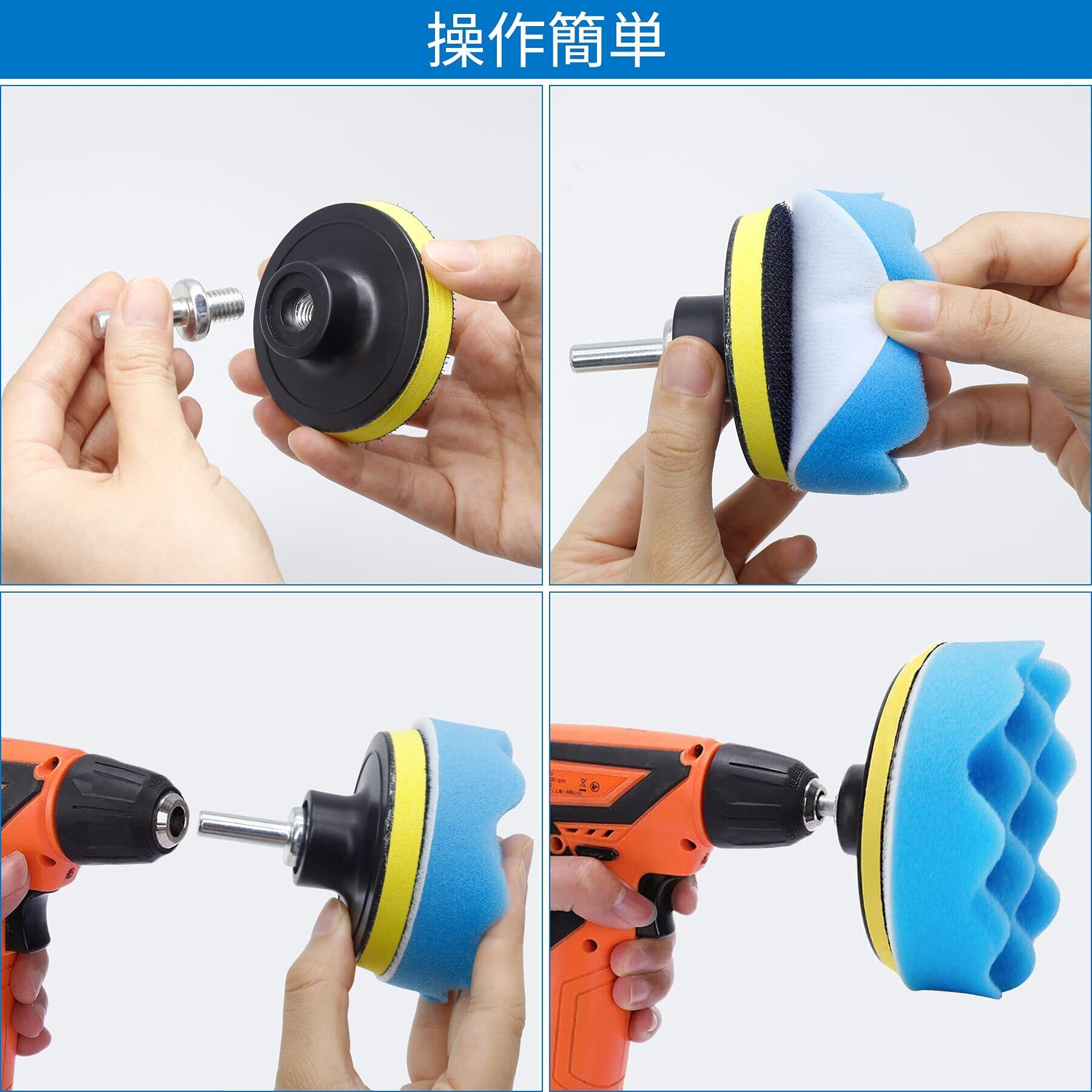 【操作簡単】すぐに使える六角軸付き 別途ドリルチャックを購入する必要がなく、すぐにお使いいただけます。 【対応機種】 六角軸電気ドリル電気ドライバー ※軸径6.35mm 簡単着脱 スポンジとパフの裏面はマジックテープ式なので、一瞬で簡単に装着可能です。