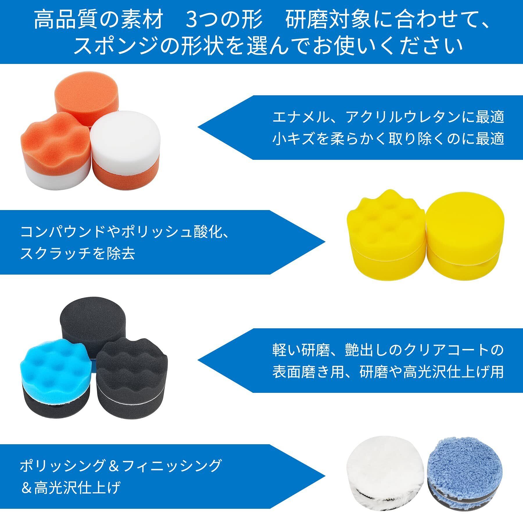 【高品質のスポンジ】超弾性、靭性及び超強吸水能力、材質が柔軟で、ペンキを損傷しません。独特なデザインの波型 磨く対象に合わせてスポンジの形状(波形スポンジ、平型スポンジ)をお選びいただけます。上質なウールの研磨パッドは、より大きなクリーンホコリと車を研磨する能力を備えています。