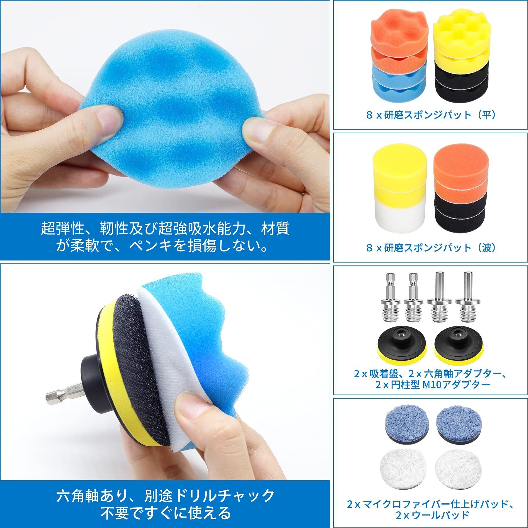 【梱包内容】16x80mm研磨スポンジパッド 、2xウールパッド、2xマイクロファイバー仕上げパッド、2x吸着盤、2x六角軸アダプター、2x円柱型 M10アダプターを含みます。ご注意:・スポンジ部分をはがす場合は、マジックテープ部分を掴みゆっくりと剥がして下さい。 ・スポンジを水洗いする際は、本体から先に剥がした後に洗浄して下さい。