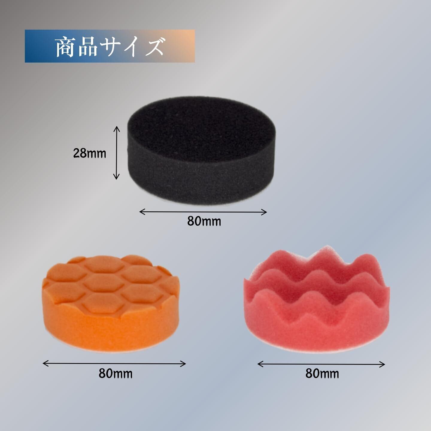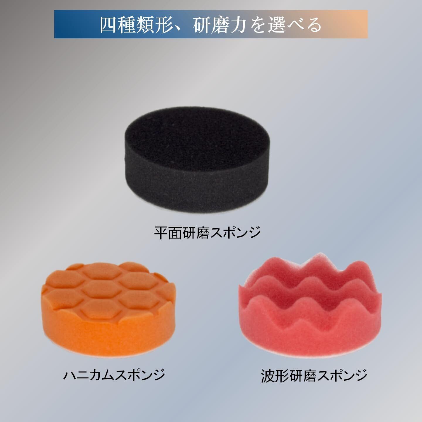 【ポリッシャーセット内容】①研磨スポンジバフ (平面スポンジ5個、波形スポンジ4個、ハニカムスポンジ3個)直径80mm、厚み28mm 合計12点セットです。このセットは家庭用の電動ドリルや電動ドライバーにもフィットします。