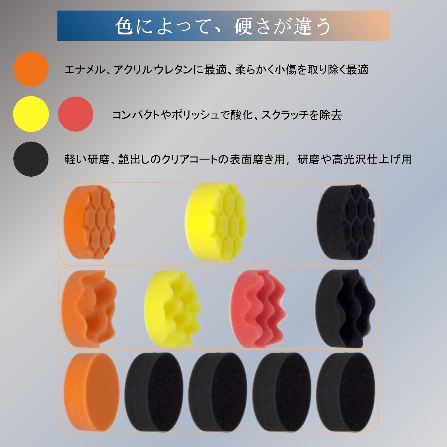 【ポリッシャースポンジ総合セット】この研磨スポンジは、色によって粗さと硬さが異なり、白 > オレンジ > 黄色 > 赤 > 青 > 黒の順にグレードが表示されます。研磨バフには柔軟なスポンジ素材が使用されており、超弾性、超靭性、強い吸水性、優れた空隙率を備えています。弾力性があるため、車の塗料を傷めることなく、安全にご使用いただけます。