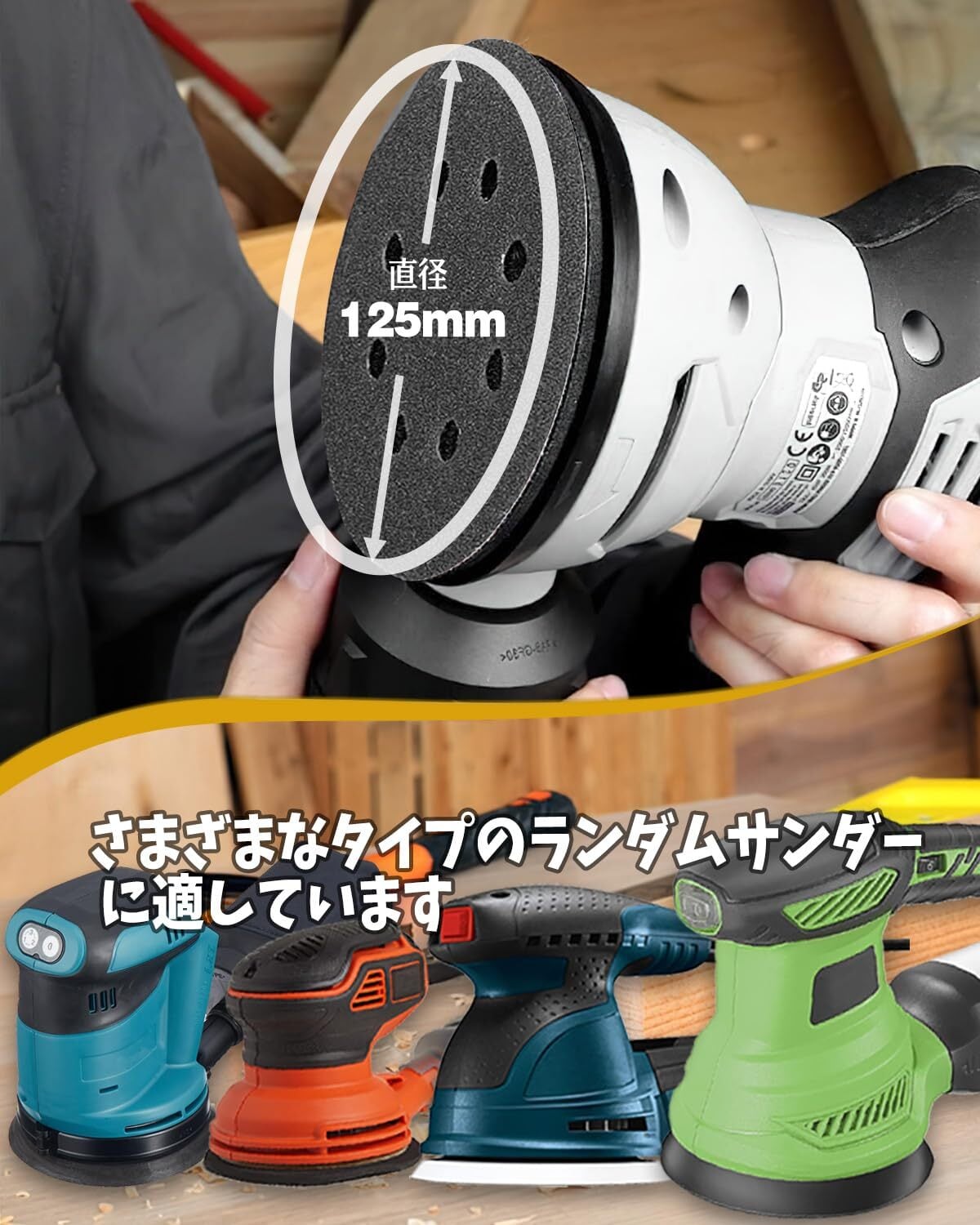 【ユニバーサルな仕様】直径125mm(5インチ)の標準サイズのサンディングパッドに対応しており、各種タイプのランダムサンダー(偏心サンダー)に適合します。DIY作業に最適なセットです。