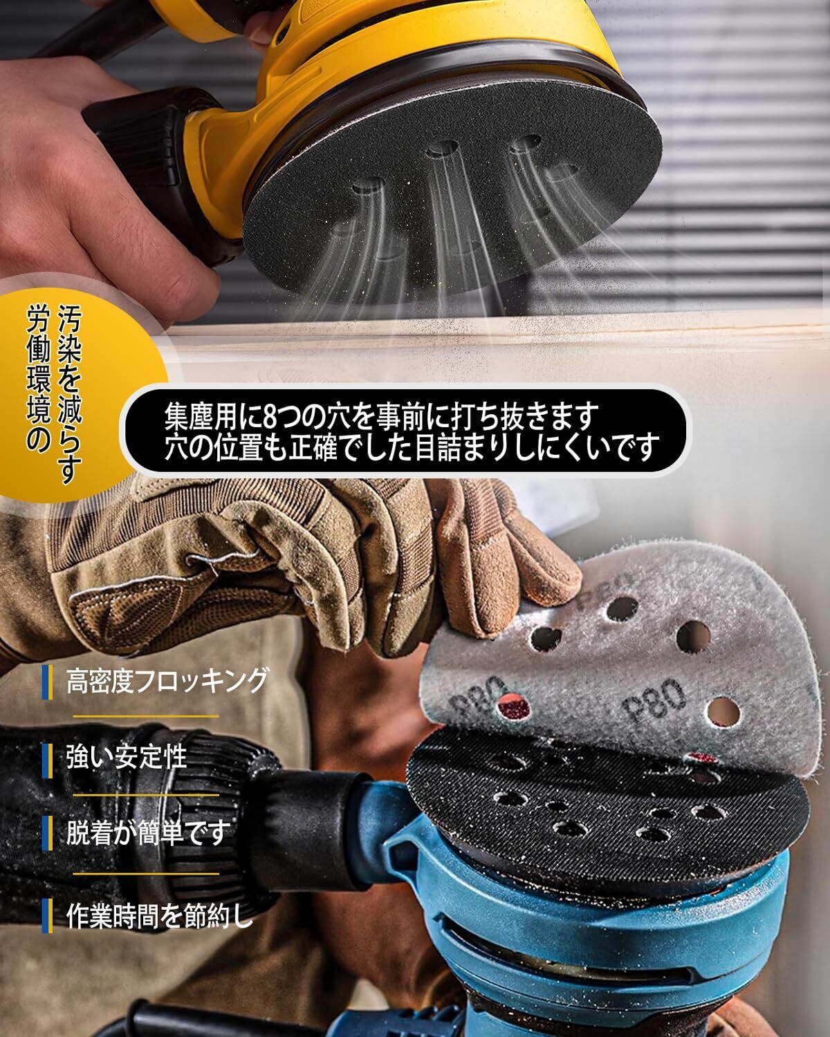 【使いやすいマジックテープ式】簡単に装着でき、強力な吸着力で外れにくい設計です。高速研磨時にも安定して耐久性を発揮し、作業時間を短縮します。集塵用に8つの穴を正確に打ち抜いており、目詰まりを軽減。さらに、1枚1枚に番手が裏面印刷されているので、識別が容易です。