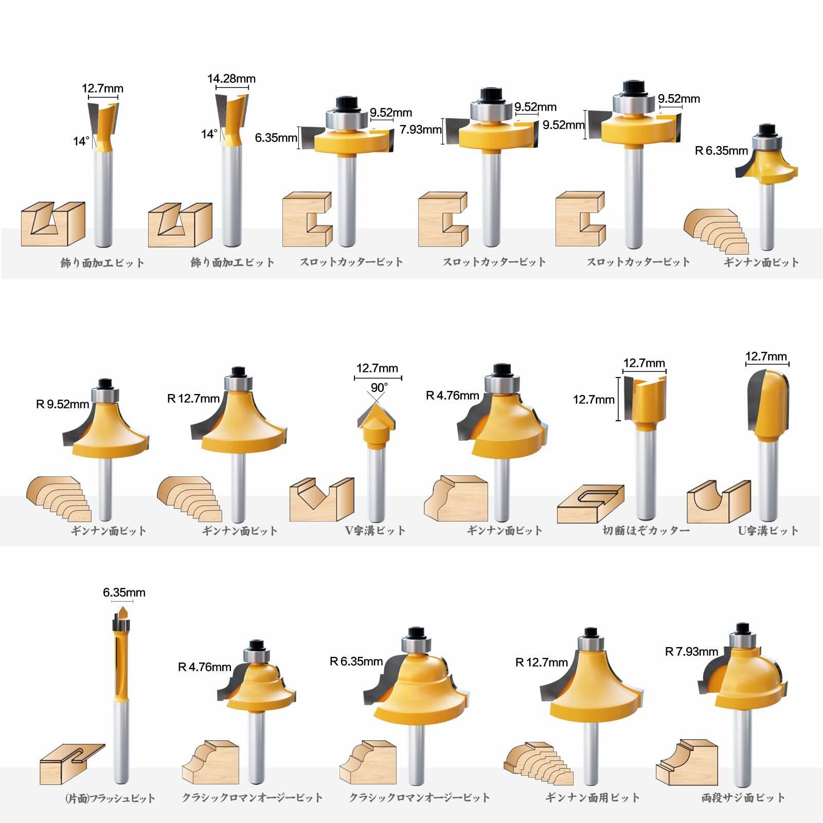 ▲35本組, シャンク径: 6㎜。溝ほり 面取り 飾り面加工用。ルータービットの刃部にHS1合金を採用し&表面塗装, 切断速度と耐磨耗性に優れています。