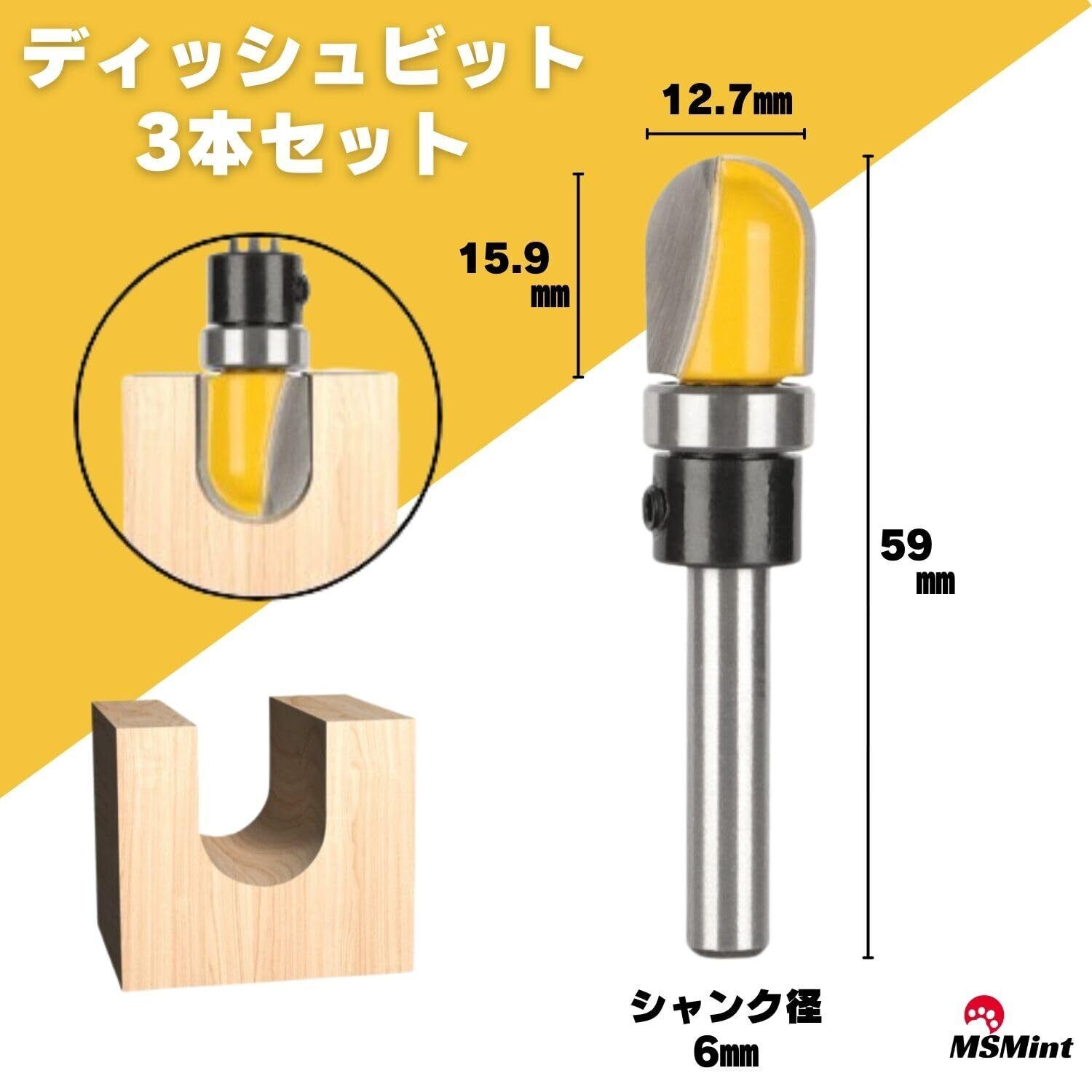 MSMint トリマービット ルータービット 6㎜軸 木工 コロ付 丸溝ビット U溝ビット 皿 トレイ (ディッシュビット 3本セット)