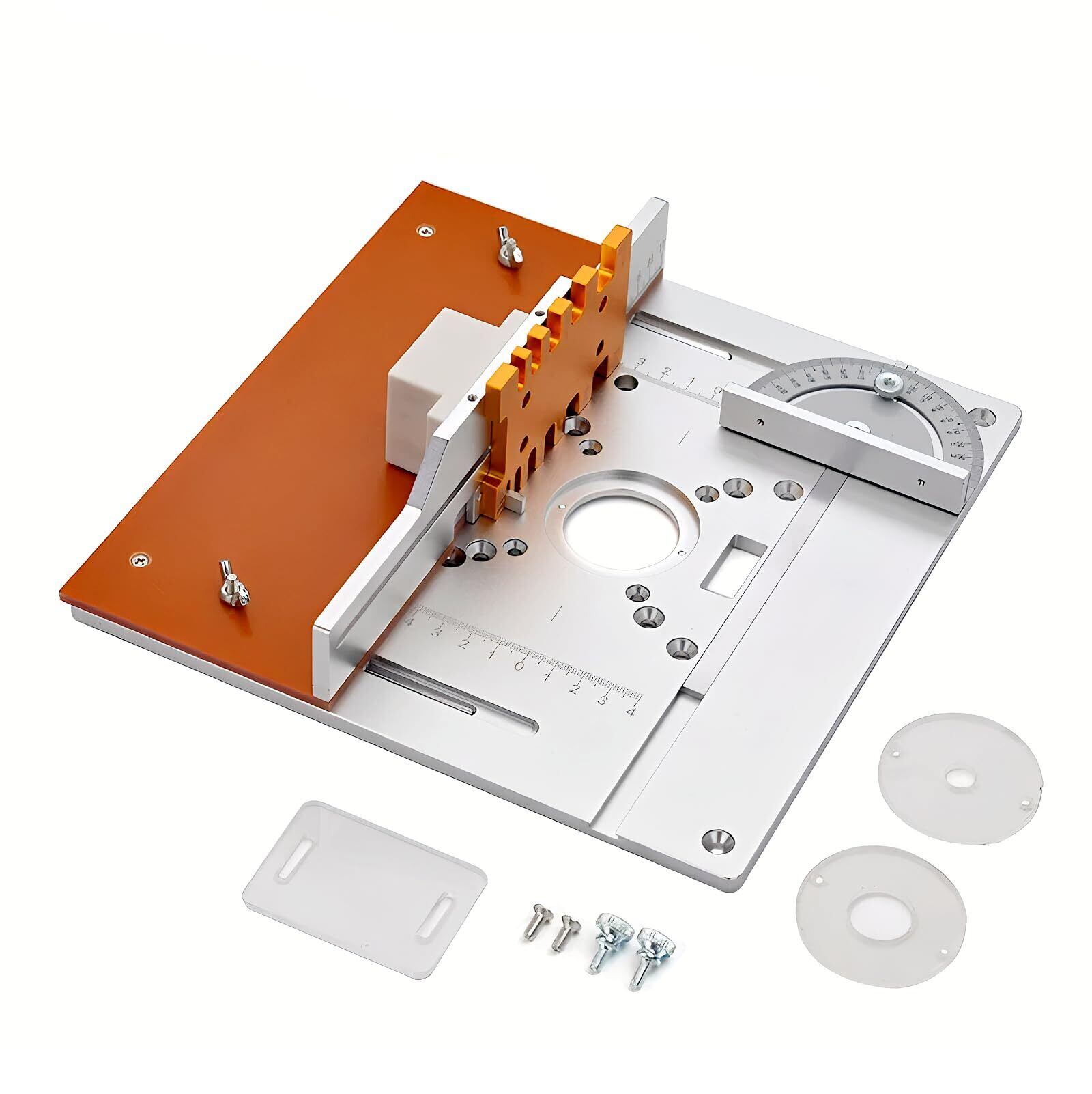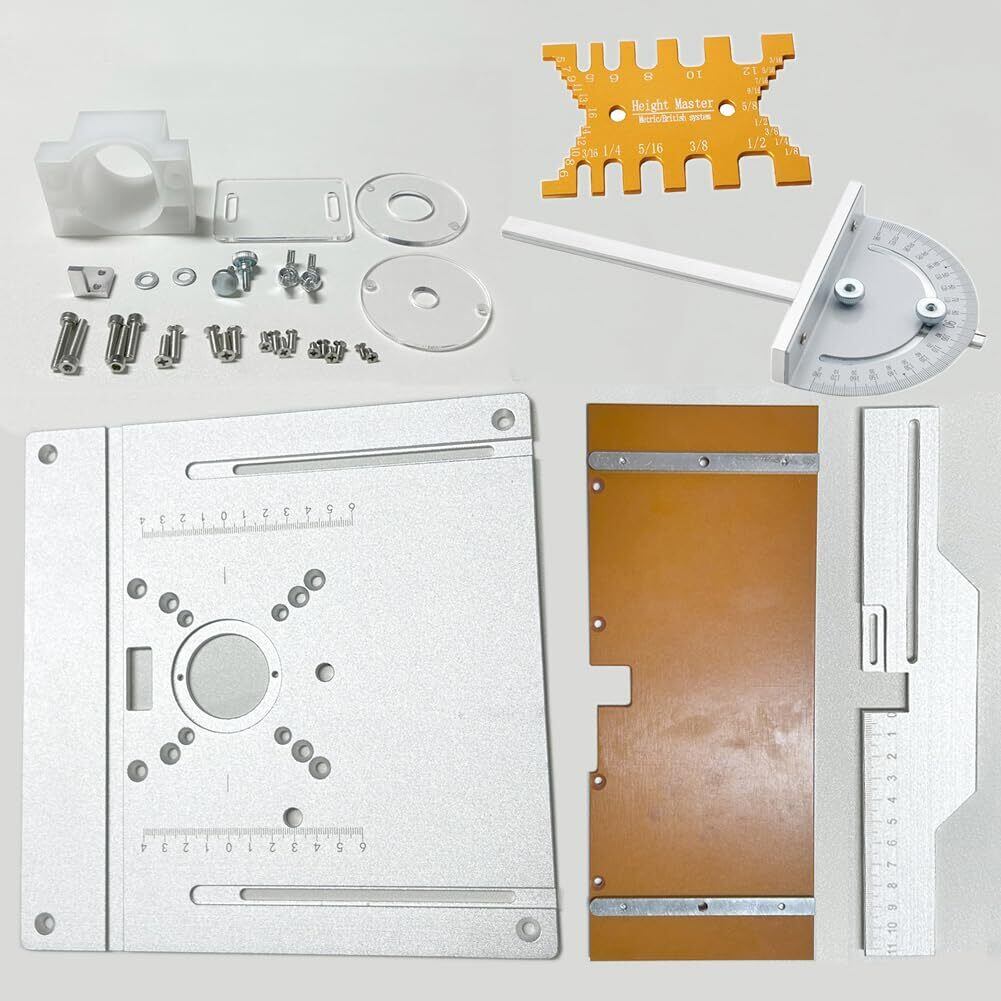 【パッケージ内容】:ルーターインサートプレート:1;プッシュブロック:1;防塵ボード:1;角度器:1;ほぞつぎ:1;ネジ類:1セット。