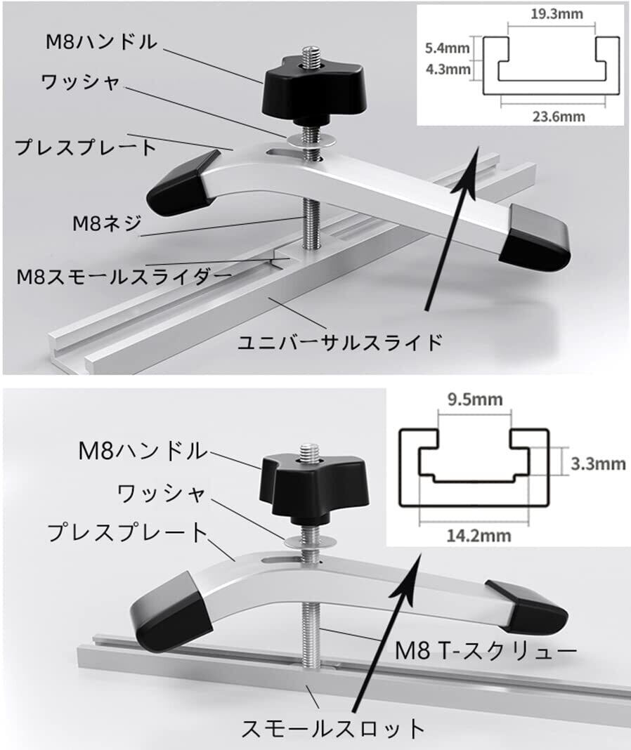 幅広い用途:これらのクランプは、ワークの保持、位置決め、および固定のための多くの木工および金属加工のアプリケーションに役立ちます。 フラッシュ装着されたTスロットのTトラックに沿ってクランプ圧力をかけることができます。