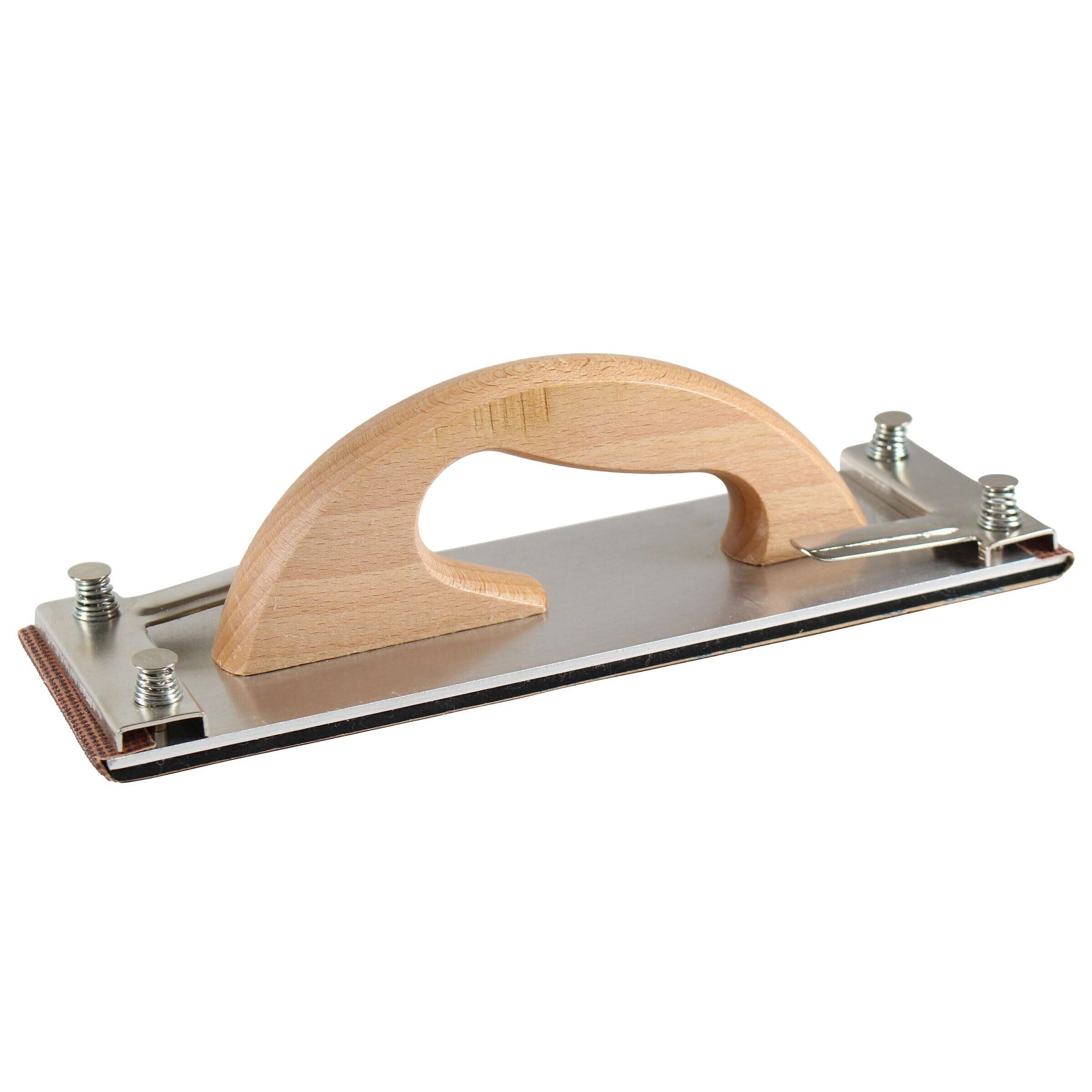 サンドペーパーを前後のワンタッチレバーではさみ込むだけで取付ができ、手に馴染みやすい木製グリップは研磨作業の負担を軽減してくれます。