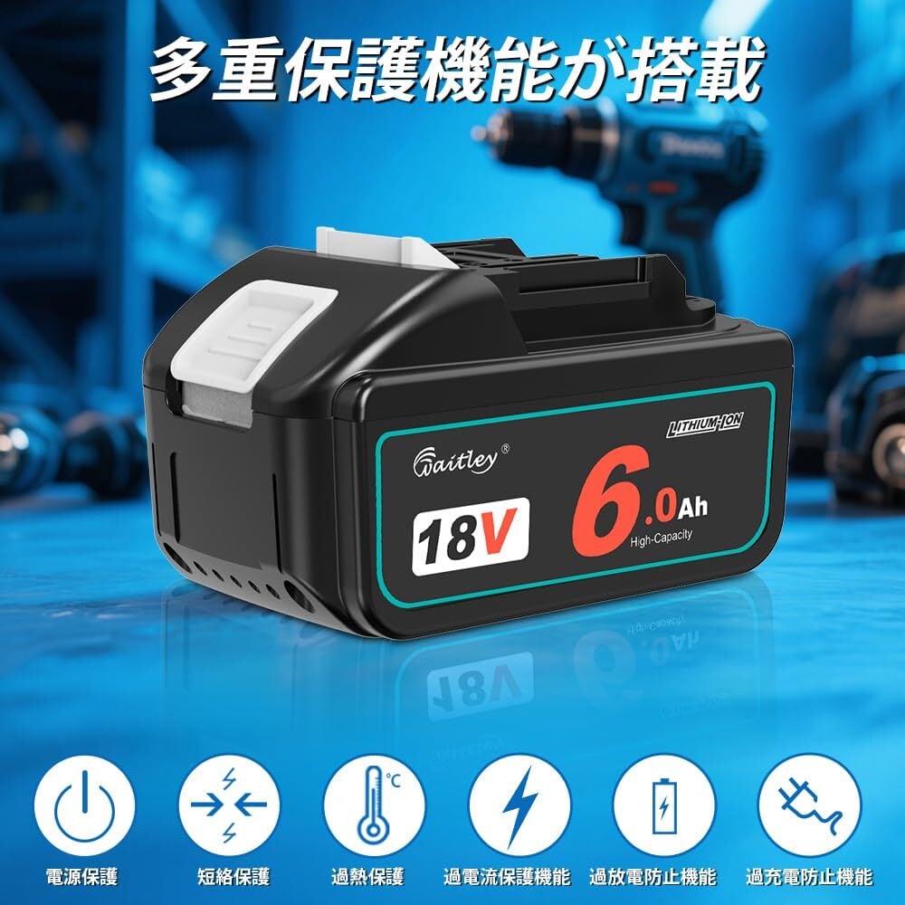 Waitley マキタ18V バッテリー互換 6.0Ah 2個セット 確実にカットオフ機能、過電流保護、過放電防止機能など多重回路保護機能が搭載 デジタル%残量指示付 大容量電池 6000mAh BL1860B 最新セル採用 高耐久性 電動工具用 バッテリー マキタ18V電動工具に対応 BL1840 BL1850 BL1850B BL1860対応 PSE、CEマーク取得済み