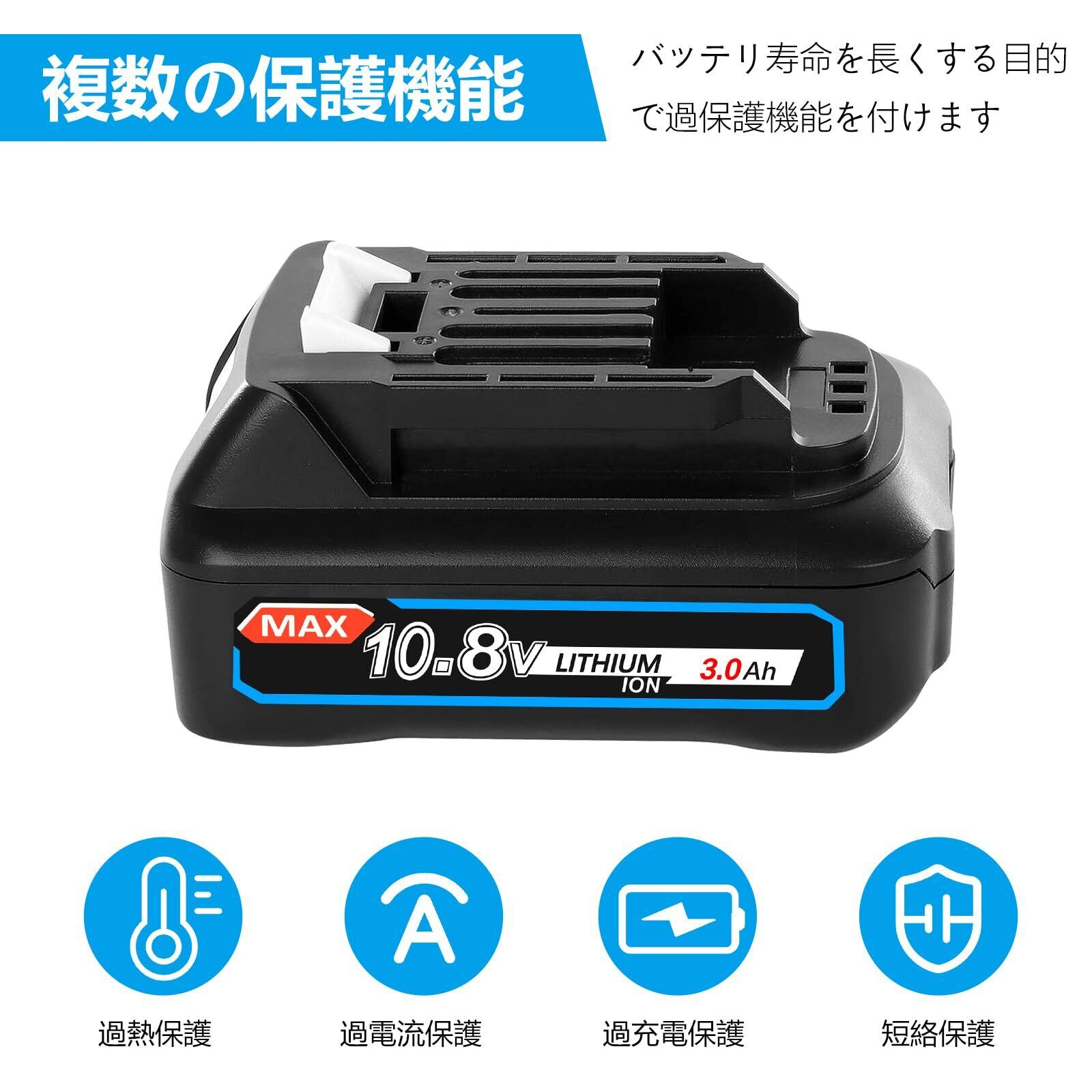 【商品仕様】BL1015 互換品 マキタ10.8vバッテリー 電圧:10.8v 容量:3000mAh 1個高品質互換バッテリー 【保護回路】過電流保護機能、過充電防止機能、過放電防止機能などの保護回路が内蔵され、長期使用できます。純正バッテリーと同様に使用でき、遜色がない互換品です しかも、純正品にない3.0Ah大容量。