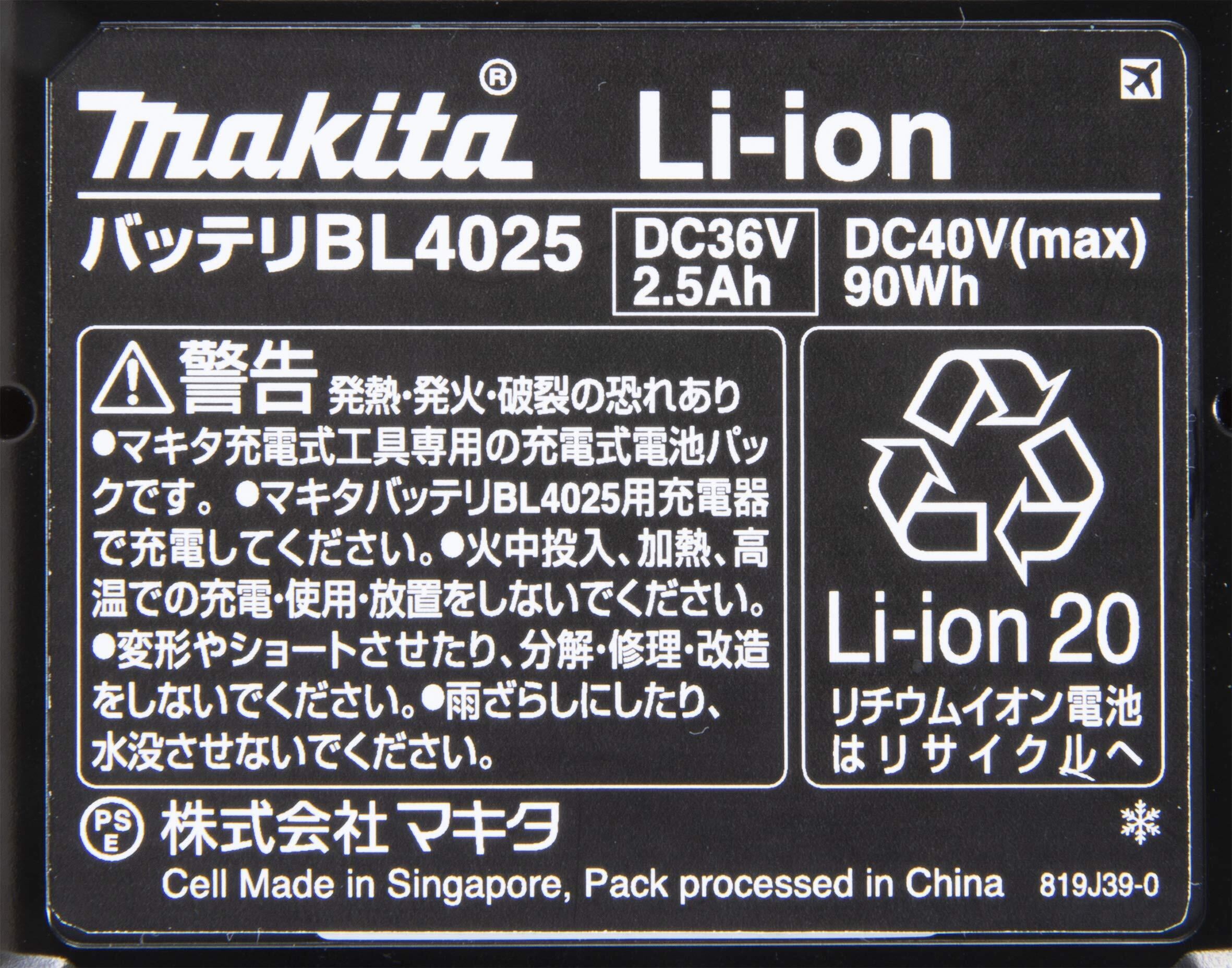 電圧: 36V(40Vmax)・容量: 2.5Ah
