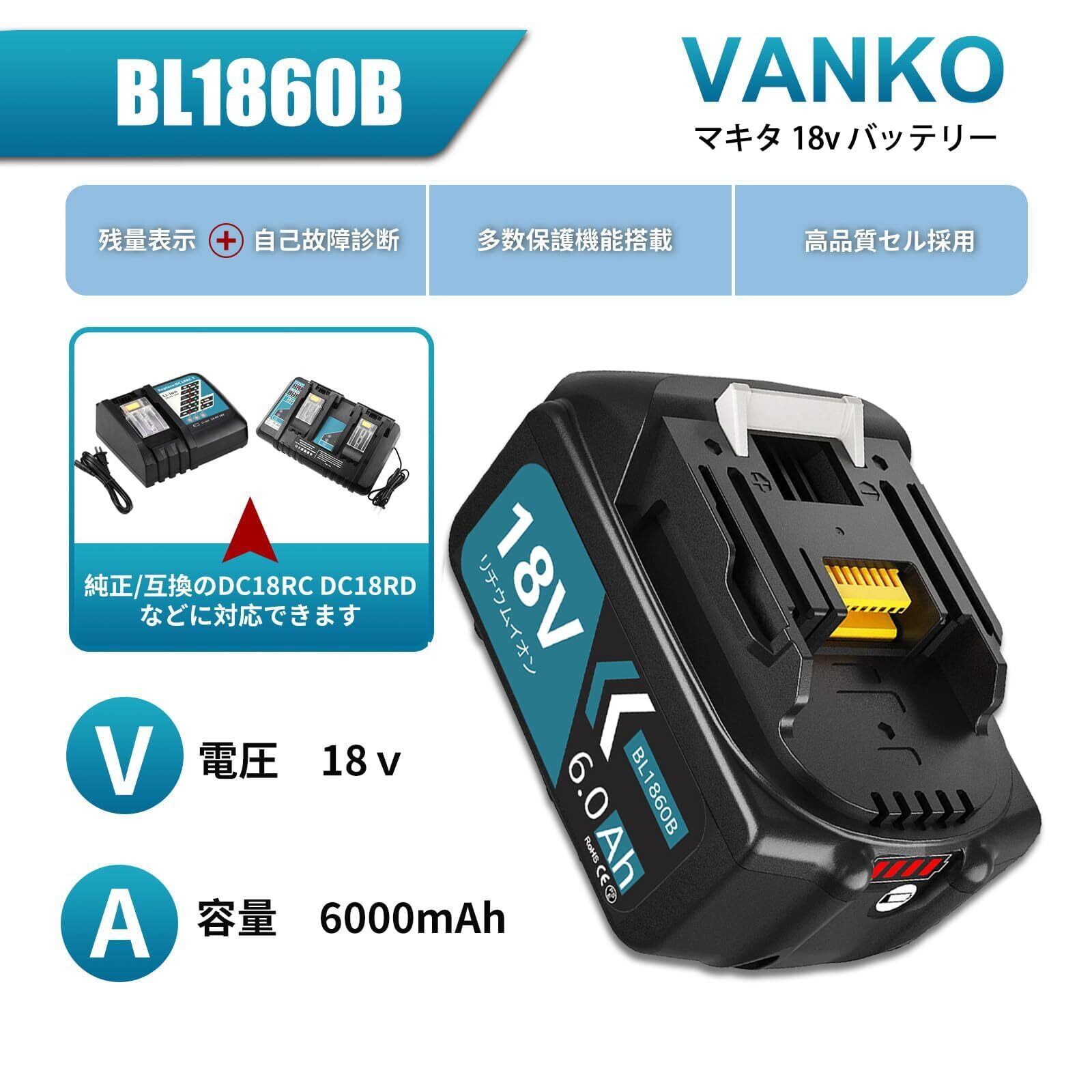 【在庫限り】VANKO 互換 マキタ 18v バッテリー BL1860B 6.0Ah大容量 2個セット マキタ バッテリー 18v BL1815N BL1820B BL1830B BL1850B BL1860Bなど対応可能 LEDランプ残量表示 BMS基板搭載 多数保護機能付き PSE、CEマーク認証取得済み 3億円のPL保険付 ブルー