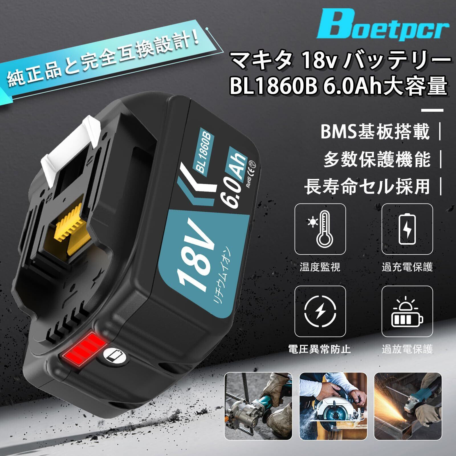 【商品仕様】Boetpcr 互換 マキタ 18v バッテリー BL1860B 電圧:18v 容量:6000mAh 個数:2個セット 種類:リチウムイオン電池 認証:PSE、CEマーク取得済み。高品質採用:多機能付き:バッテリーは残量表示が付いています。ダブル新機能付き:残量表示✙自己故障診断。BMS基板搭載には充電を制御する保護回路を内臓!過電流保護機能、過充電防止機能、過放電防止機能など保護回路が内蔵されて、ご安心してご使用頂けます。寿命特性、充電時間、連続使用時間が純正品と比べても遜色がないです。