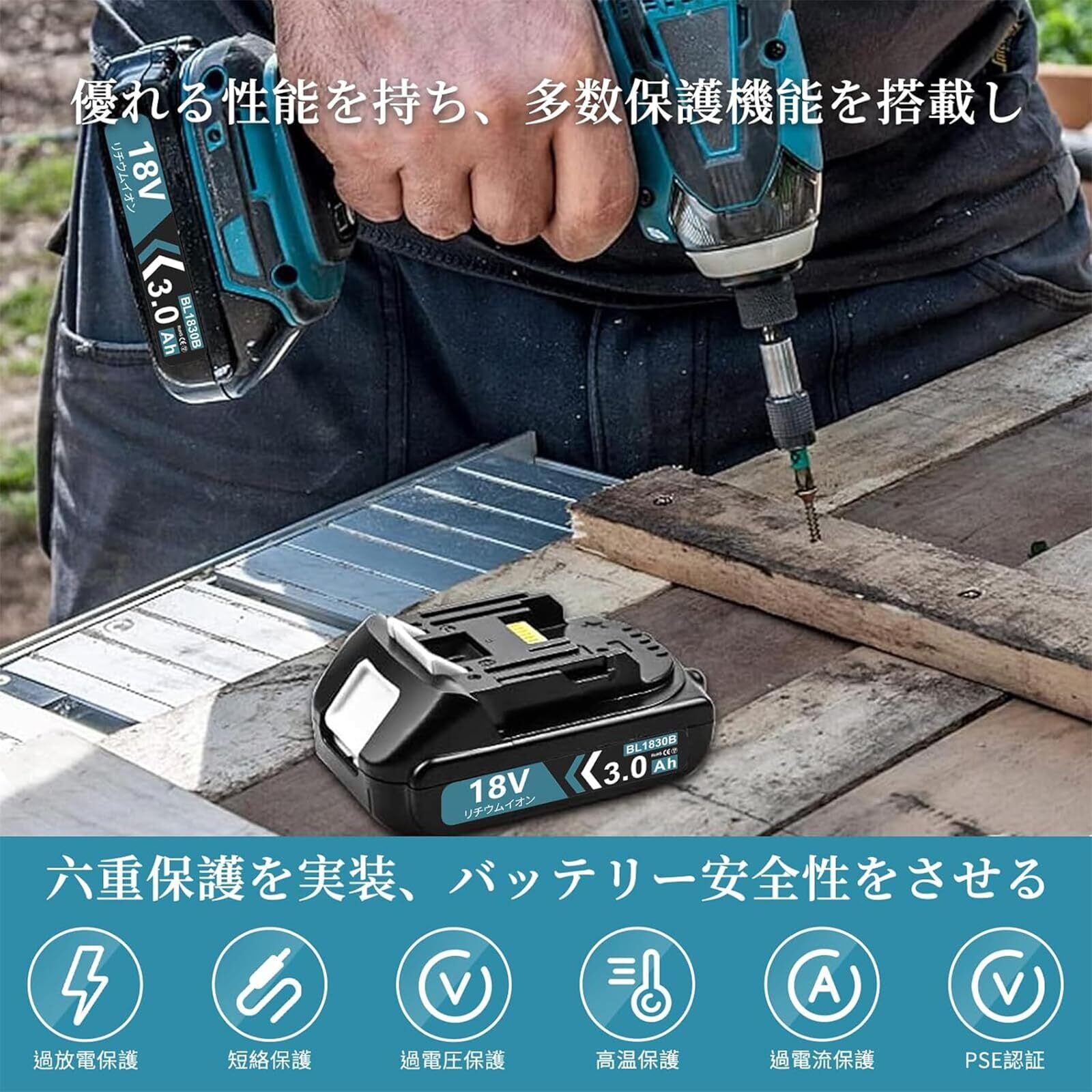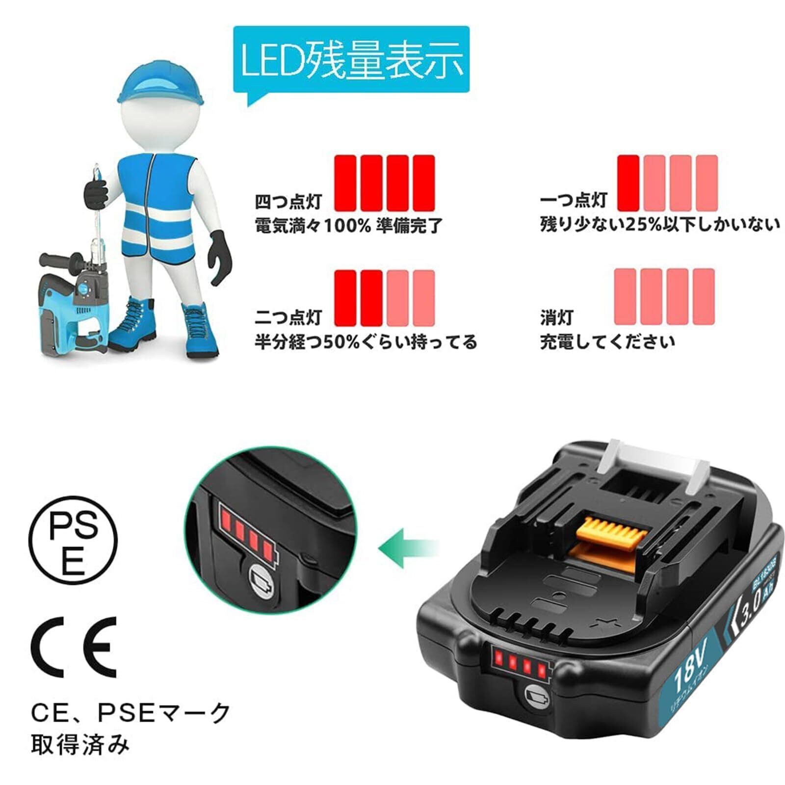 【優れる品質】安いのに高品質のマキタ 18v バッテリーです!フルスピード充電技術:快速充電が可能です。残容量表示+自己故障診断:バッテリーの状況もランブでお知らせ!LEDランプ残容量が一目瞭然:バッテリー残量表示ボタンを押したら、4段階の残量ランプが点灯します。