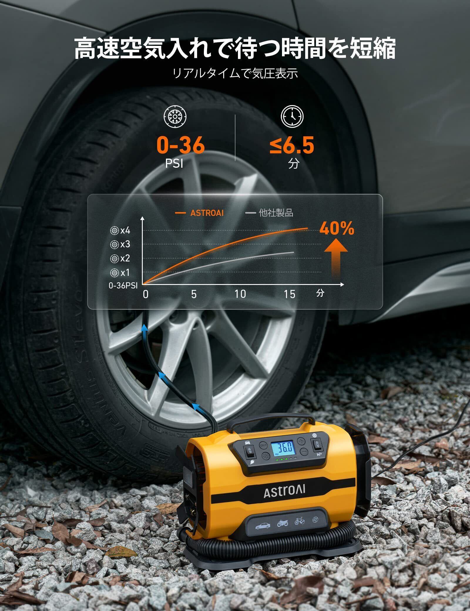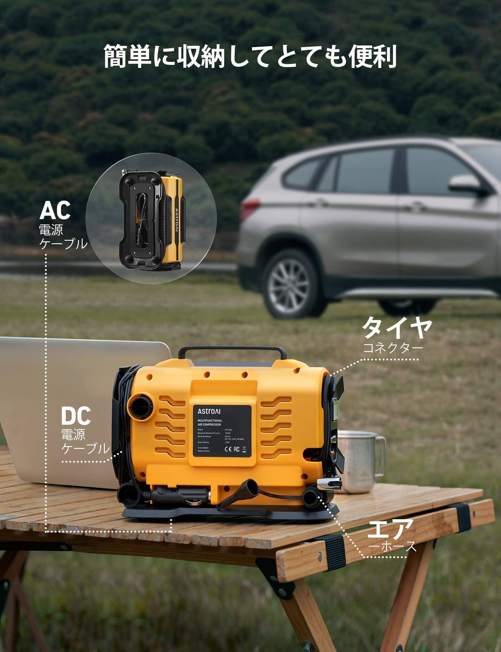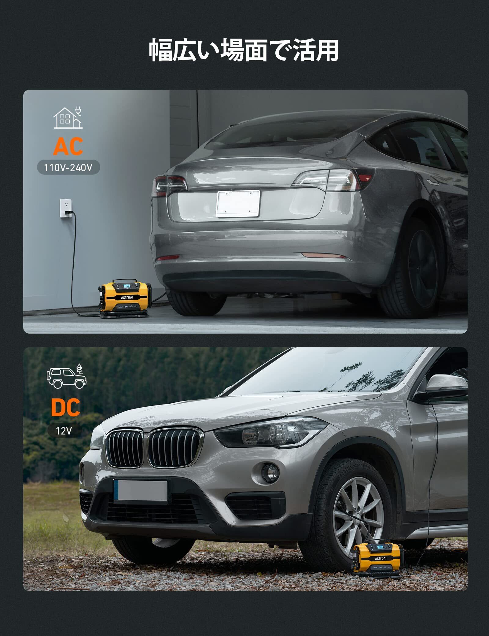 ️【2種類の電源】AstroAIエアコンプレッサーはデュアル電源、自動車の12Vシガーライターと120Vの家庭電源対応、家庭とドライブの使用時の便利さが特徴的です。