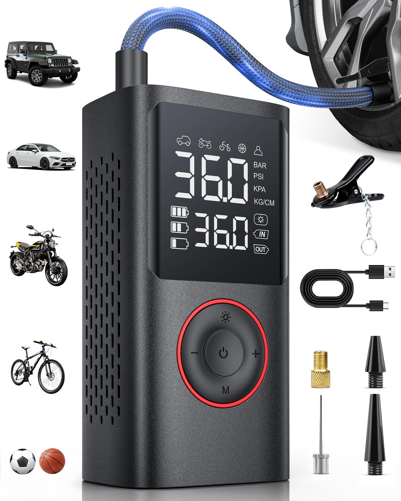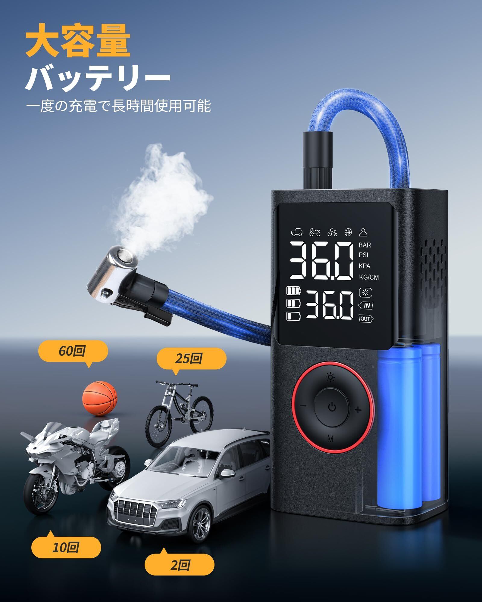【数量限定】自転車に使える電動空気入れ、携帯型エアーポンプ・コンプレッサー、150PSI対応・デジタル圧力計搭載・自動停止&LEDライト付, 8.89 X 4.75 X 13.75CM