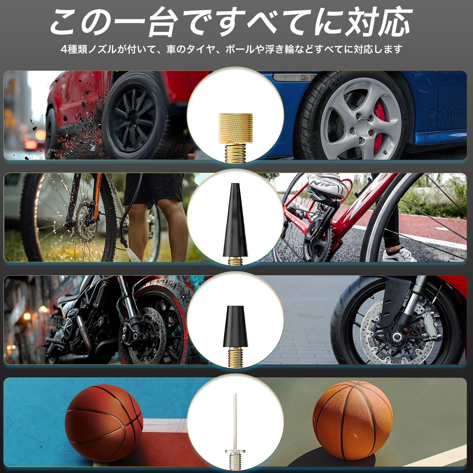 【4種ノズル&仏米式バルブ完全制覇】 付属の4種類耐衝撃ノズルで、自転車(仏式)、車(米式)、ボール、浮き輪に瞬時対応。ワンタッチ接続で工具不要、手袋着用時でも確実に装着可能。※英式バルブ非対応