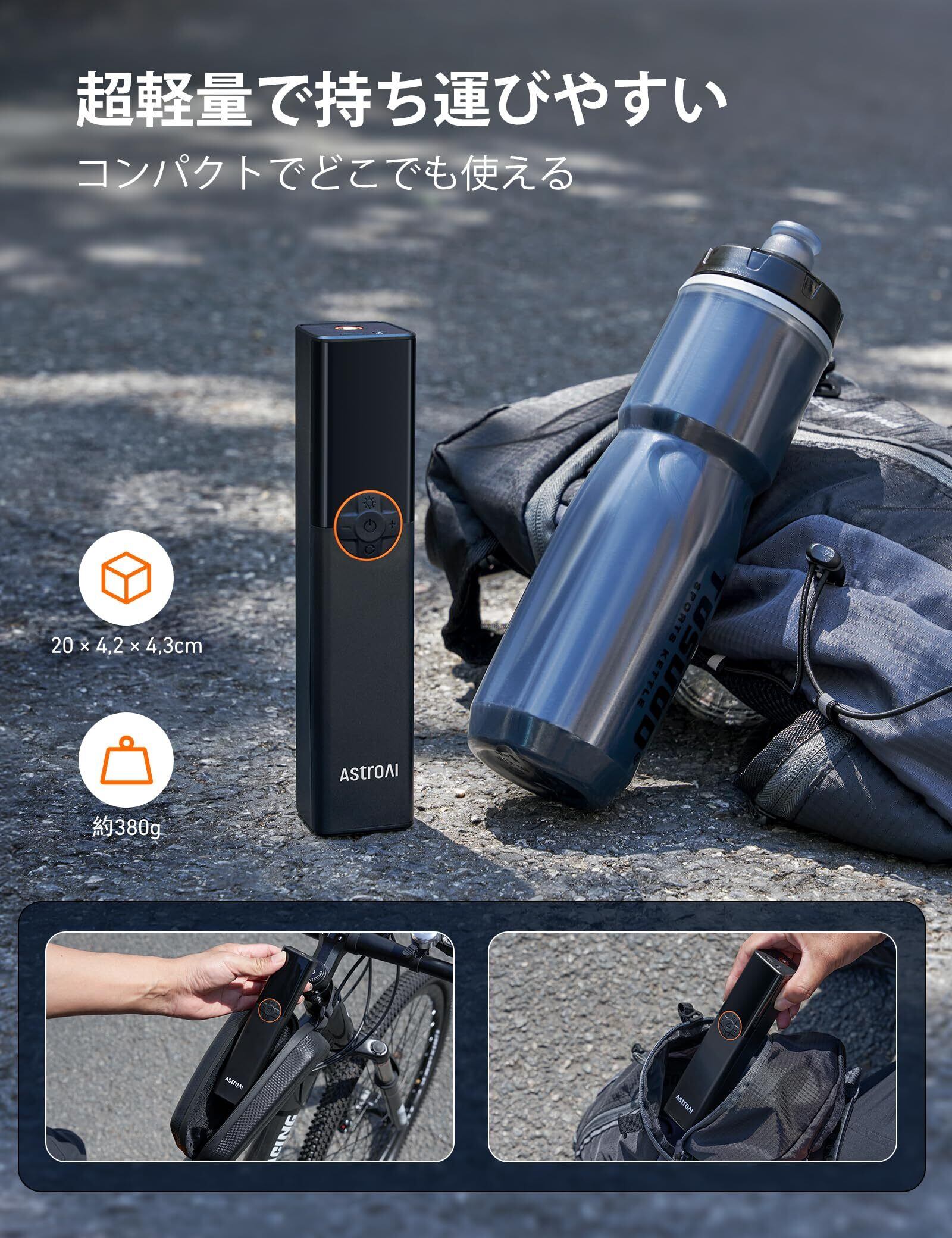 【コンパクトでポータブル】このポータブル空気ポンプは、サイズ20 x 4.2 x 4.3cm、重量380gで非常にコンパクト。リュックや自転車バッグポンプとして持ち運びやすく、どこでも簡単に使えるので、アウトドアやツーリングに最適です。