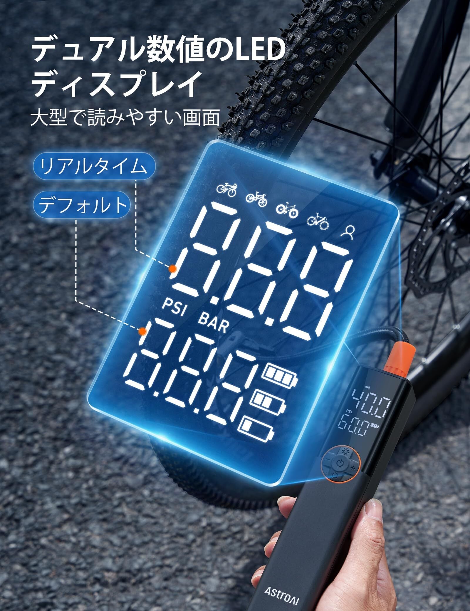 【独特な設計・自転車最適】5種類のプリセットモードを簡単に選択できます(シティバイク、マウンテンバイク、ロードバイク、ファットバイク、カスタム)。ワンプッシュで表示単位をPSIとBARに切り替え可能。必要に応じて空気圧を微調整できます。