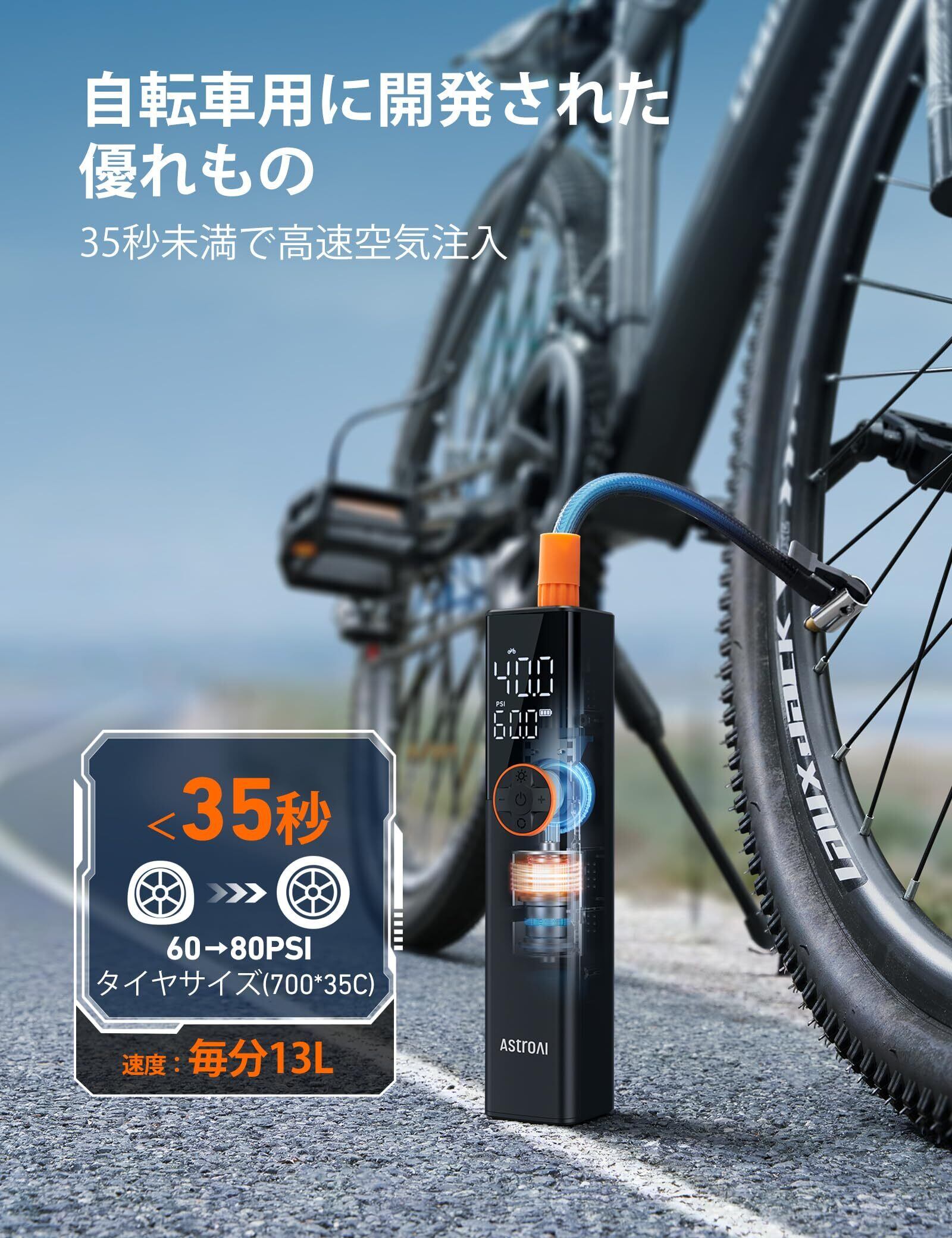 AstroAI L8 自転車 空気入れ 電動 エアーコンプレッサー コードレス 150PSI 充電式 5種類のプリセットモード 高速充填 自動停止 仏/英/米式バルブ対応 バイク/自動車/ボール