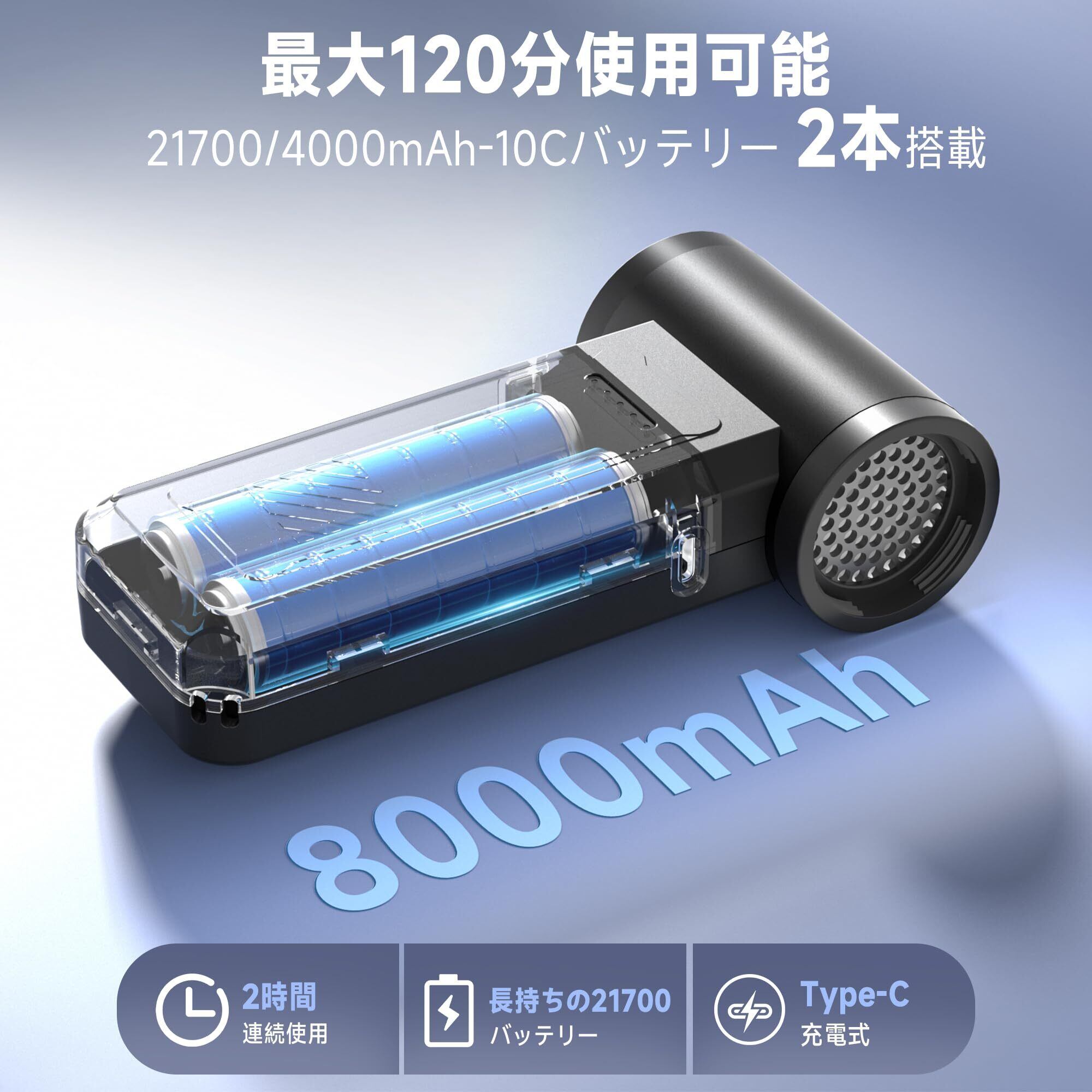 【高性能21700リチウム電池搭載で大容量&長時間使用可能】 本製品は、2本の4000mAh 21700リチウム電池を搭載し、合計8000mAhの大容量バッテリーを実現。最小風量モードでは最大約2時間の連続使用が可能で、長時間の作業でも安心してご利用いただけます。また、過充電・過放電・短絡などを防ぐ自動保護回路を内蔵しており、安全性も抜群です。長時間の使用でも安定して高いパフォーマンスを発揮します。