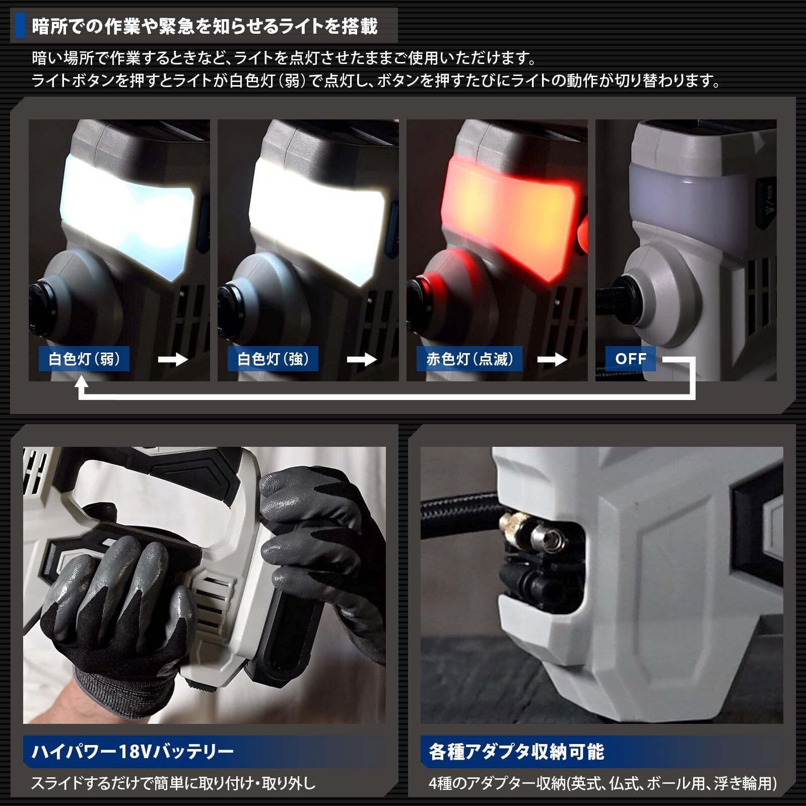 【本体 YBK-180/特徴】一般的な自転車(英式バルブ)やスポーツタイプ自転車(仏式バルブ)、ボール、浮き輪など、様々な空気入れに対応しています。充電式なので電源のない場所にも便利です。通常のタイヤ用バルブに加えて、4種類のアダプターを標準で装備(ボール用、英式、浮き輪用、仏式)。4種類の圧力単位に対応しています[psi:3.0~150.0(0.5psi単位)、Bar:0.2~10.3(0.05bar単位)、kPa:20~1030(5kPa単位)、kg/cm2:0.2~10.55(0.05kg/cm2単位)]。暗所での作業や緊急を知らせる白色や赤色に光るライトを搭載。バッテリー(別売)は1.5Ahタイプと2.5Ahタイプの2種類から使用用途に合わせて選べます。